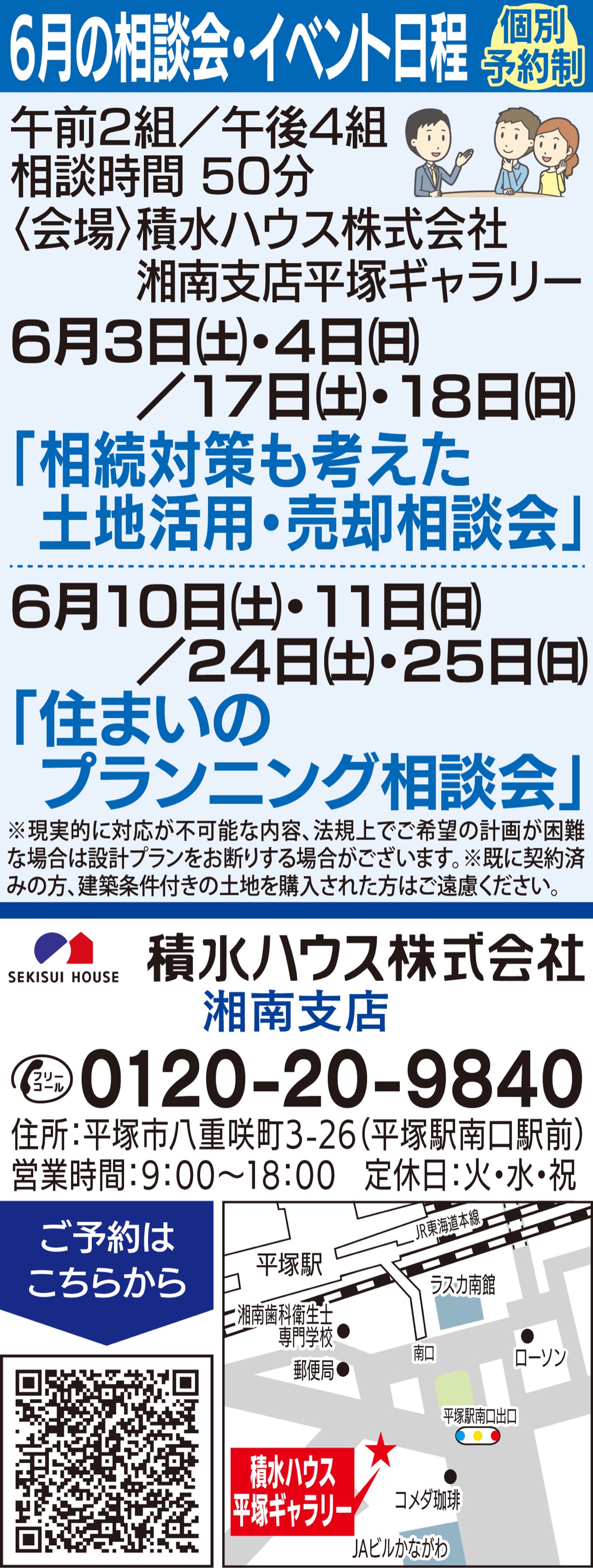6月3日(土)・4日(日)と6月17日(土)・18日(日)は「相続対策も考えた土地活用・売却相談会」を開催。「所有する土地をどうしたらいいかわからない」や「相続対策で土地を売りたい」など、土地活用や売却のアドバイスを行う。