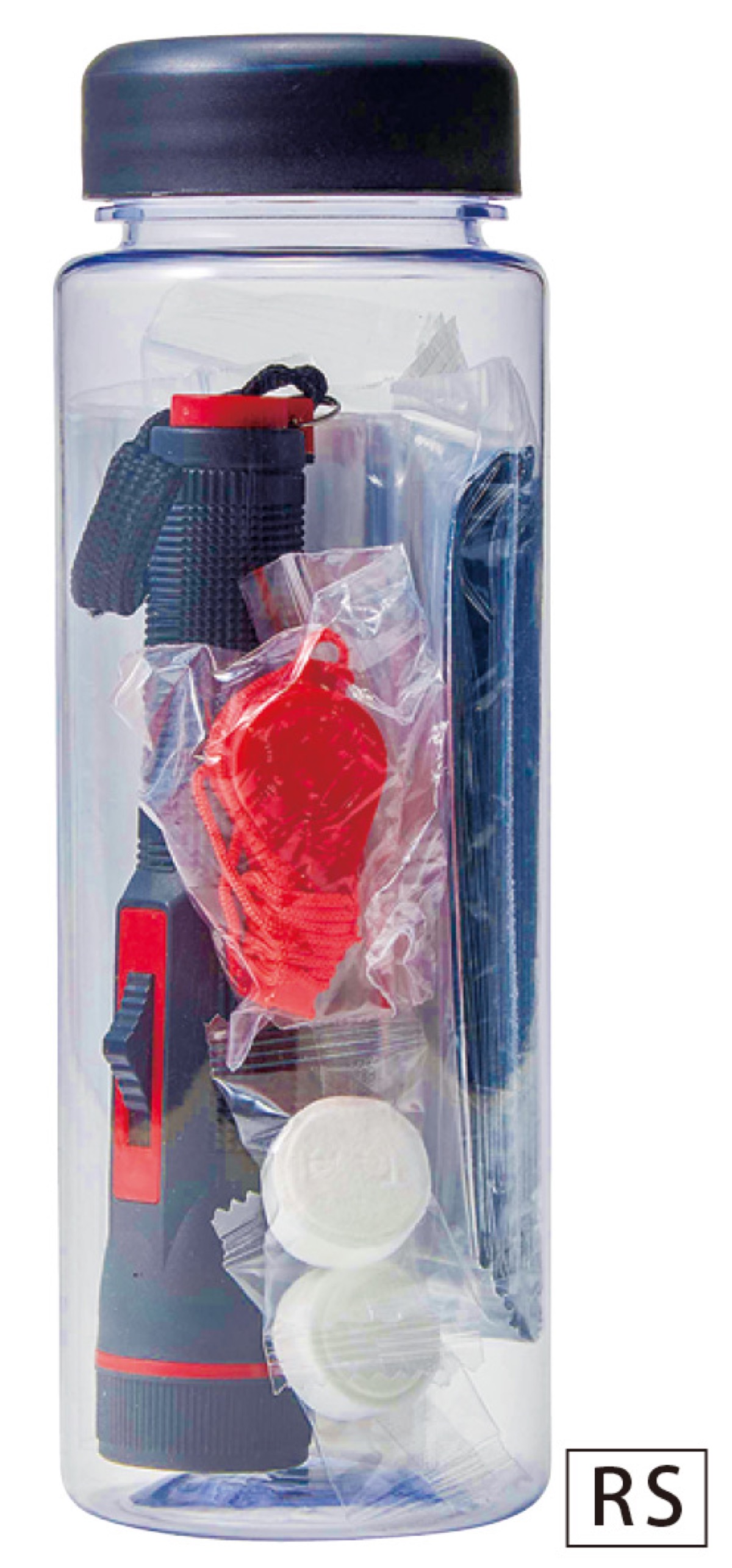 中身は【1】水などを入れられるフタ付ボトル【2】自分の位置を知らせるホイッスル【3】LEDライト【4】ペットボトルキャップ1杯分の水で元のサイズに戻る圧縮タオル【5】体温保持を助ける大判サイズのアルミシート【6】ジッパーバッグの6点。ボトルは500ミリリットルサイズ。鞄や車に入れておけば災害への心強い備えに。県内各地の社会福祉協議会や自治会などが導入済。