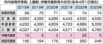市によれば、17年4月1日時点で32・3%だった保育の需要率(保育サービス定員と待機児童数の合計を就学前児童人口で割った数)は、21年に42・3%、22年には44・8%、23年に46・5%となり、6年で約14ポイント上昇した。入所申請者数も毎年最多を更新している。