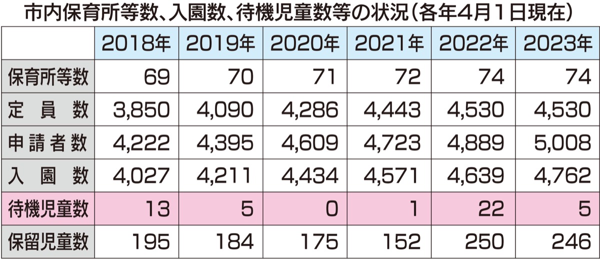 市は、2015年と16年に県内ワーストを記録したことを受け、16年秋に「新たな待機児童解消対策」を策定し、施設整備や保育士確保に取り組んできた。20年には待機児童ゼロを達成。21年も1人だったが、昨年は転入者の増加や保育士不足で22人となり、増加に転じた。これを受け市は、待機児童数の大半を占める1、2歳児の受け入れに対する補助の見直しを実施。今年は5人まで減少した。