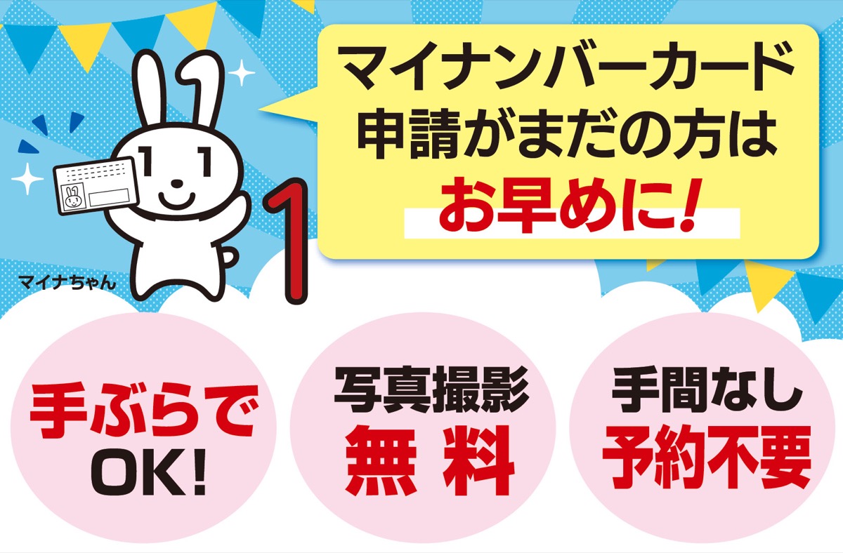 マイナポイント申込期限の9月末近くになると窓口が大変混み合うため、早めにマイナンバーカードの受け取りを。また、申請会場ではマイナポイントの手続きは行っていないので、市役所本庁舎1階のブースへ。