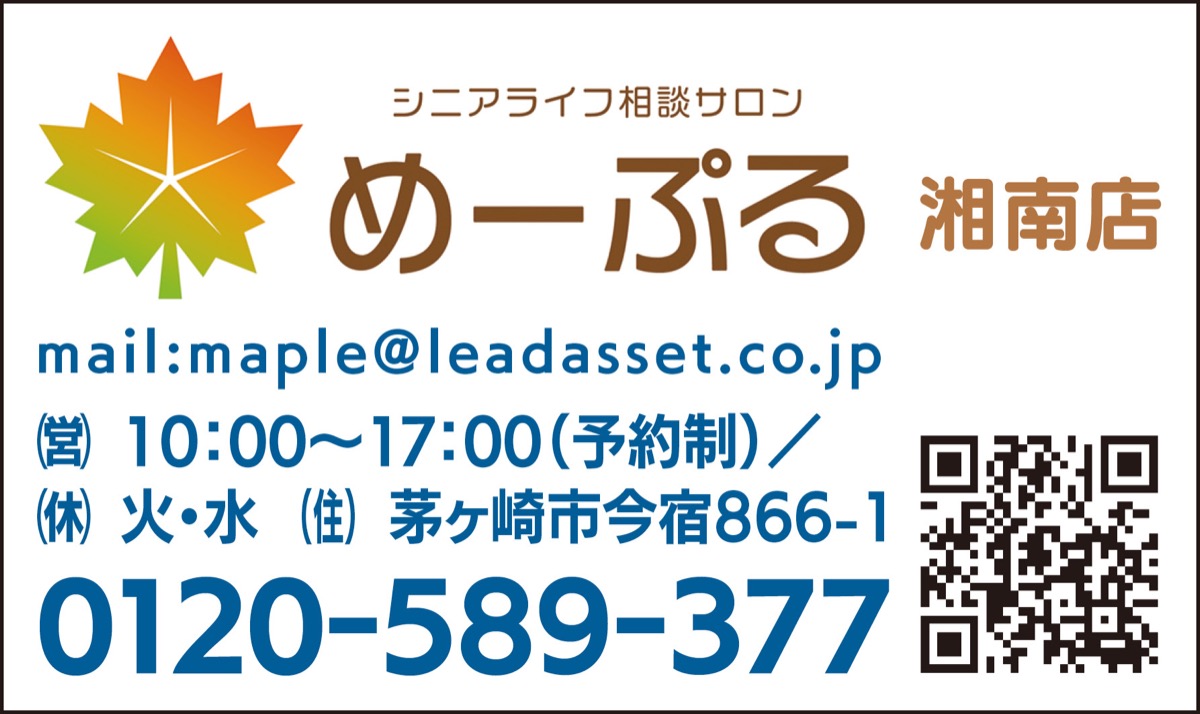 主催するのはシニアとその家族の様々な困り事にワンストップで対応する「めーぷる湘南店」。会場には同サロンの責任者でシニアカウンセラーの資格をもつ田中久子さんのほか行政書士、税理士、宅地建物取引士ら専門家が在席しており「いま相続が発生したら?」「遺言書はどうやって作るの?」「相続不動産をどうしたらよいか?」といった悩みや疑問に「完全無料」でこたえる。「当日は午前と午後に『相続不動産を考えるミニセミナー』も無料開催します」と田中さん。「相続と不動産の両方を、効率よく専門家に相談できるチャンスです。気軽にお越しください」と呼びかける。予約優先なので、左記電話かメールで申し込みを(空きがある場合は直接来場にも対応)。