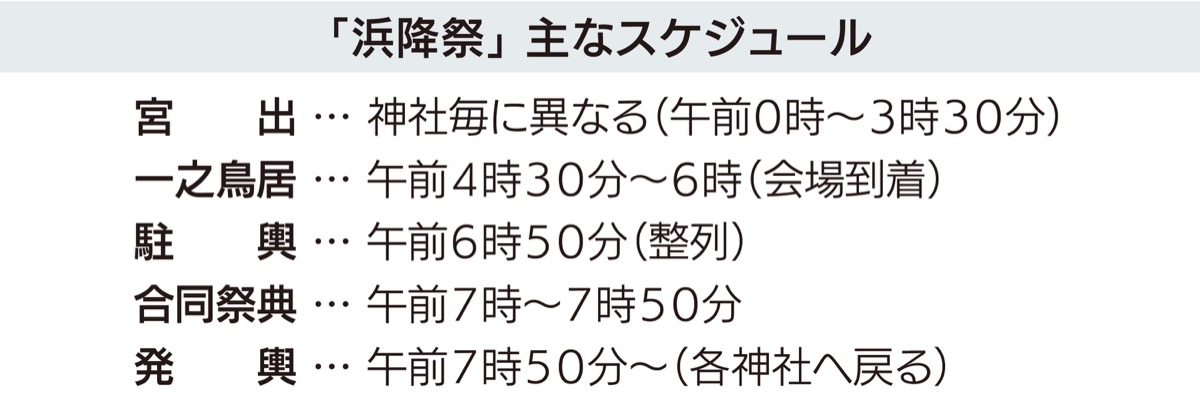 併せて、「神社によって神輿の担ぎ方が違うので見比べてみるのも面白いし、神社を出発する前に暗がりの中で幻想的に行われる『宮出』も一見の価値がある。ぜひ、地域の神社に足を運んでその様子を見てもらえたら。4年ぶりの浜降祭を存分に楽しんでほしい」と呼び掛けている。