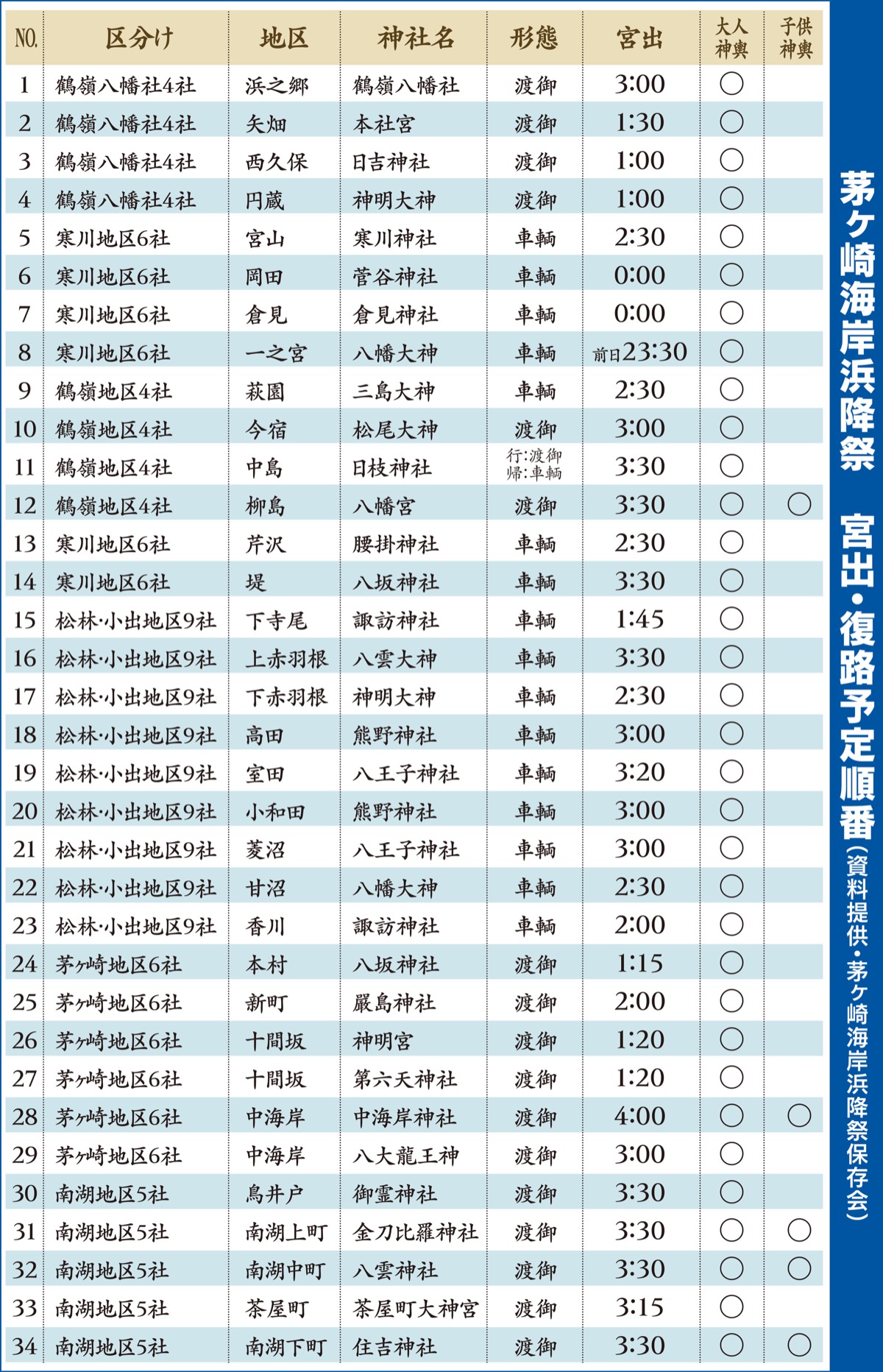 神輿が神社を出発する「宮出」は市内では早ければ午前1時から始まり、合同式典は茅ヶ崎西浜海岸で7時から実施される。式典終了後の8時ごろから神輿が一斉に海へと向かう「お発(た)ち」(発輿)が行われ、9時に終了。神輿がみそぎをするのは入場時と式典後の帰路につく前の2回だが、祭典関係者は「海の状態によっては入らない場合もありますが、神輿の見どころとしては式典後の8時過ぎがお勧め」と話す。