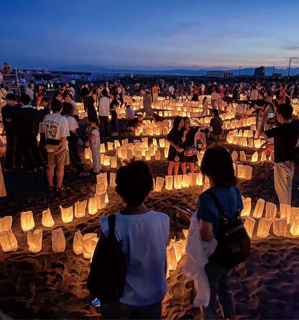 昼間には感じることのできないビーチの魅力を感じてもらおうと始まった夏の恒例イベント。18回目を数えた今回は、アーティストによるストリートピアノの演奏で幕を開けると、来場者が次々と演奏。加山雄三さんや、サザンオールスターズの曲が聞かれ、中には歌も合わせた参加者もいた。暑い中、行灯づくりに励む親子や、「浜辺のキャンドル+竹灯りトワイライト」に向けて3000個のキャンドルと竹灯りオブジェの用意に汗する学生ボランティアらも見られた。日が暮れてからは浜辺が幻想的に演出され、烏帽子岩もライトアップされた。