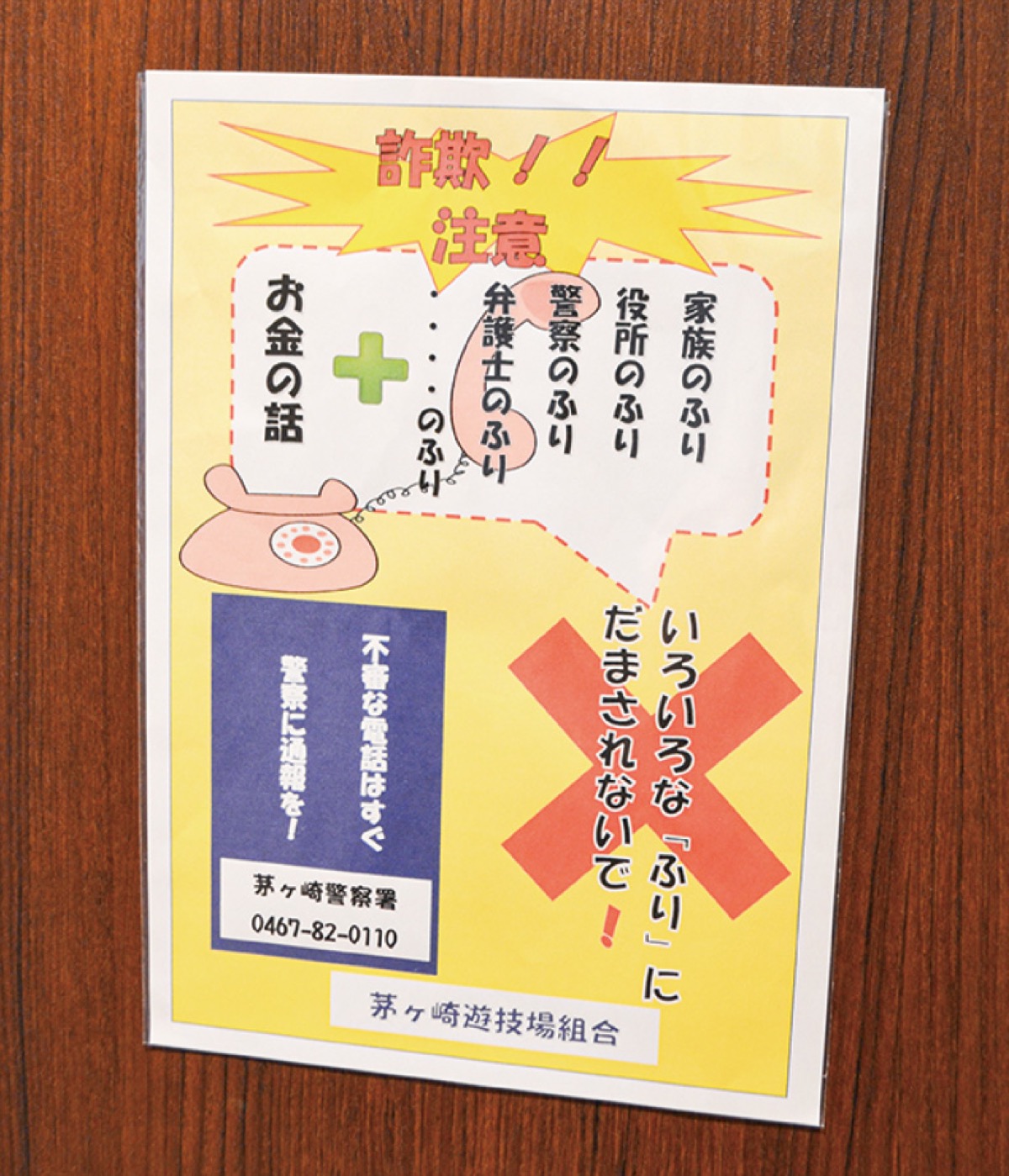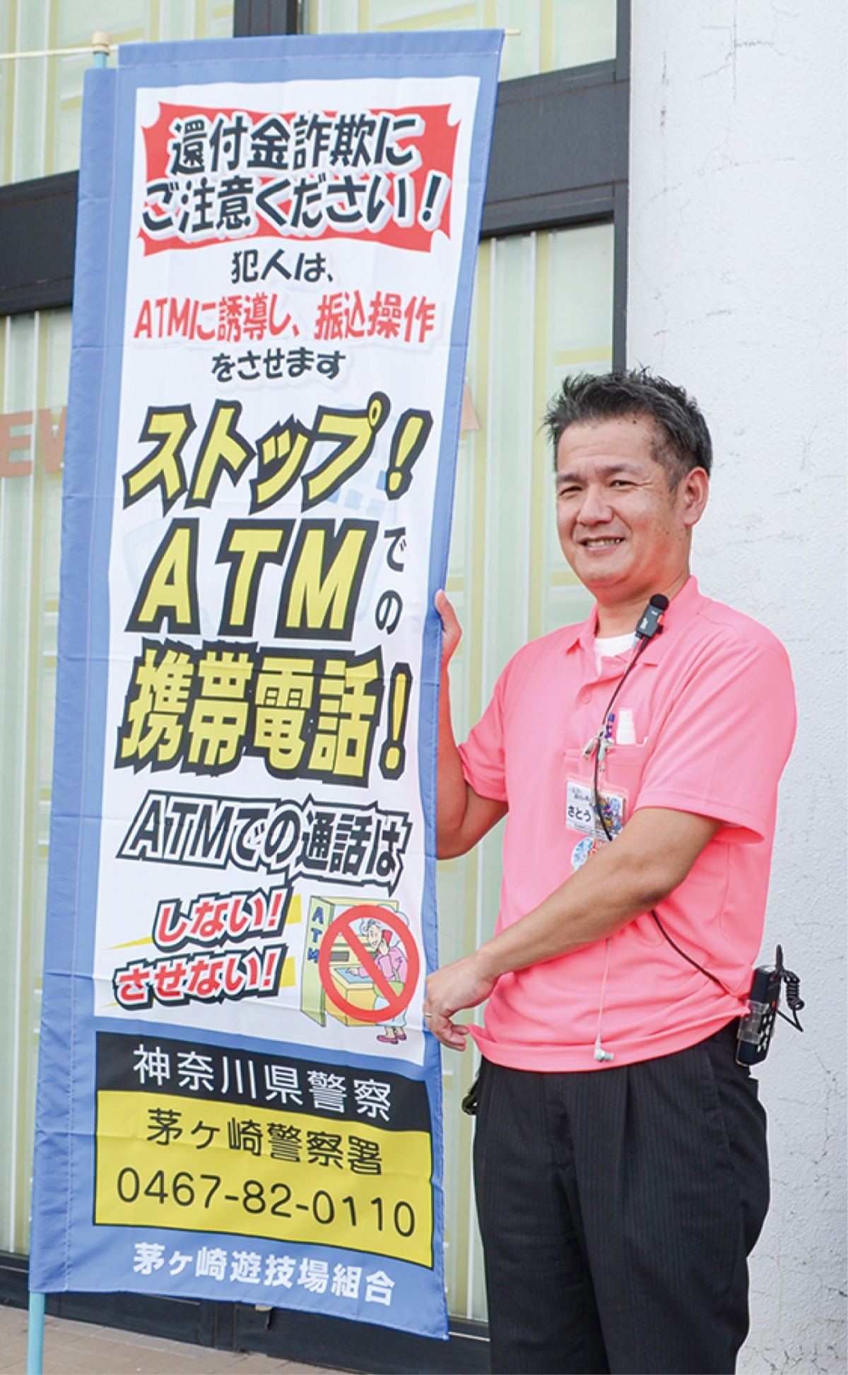 制作にあたっては、茅ケ崎警察署生活安全課にアドバイスを仰いだ。特に最近は警察官や弁護士を名乗って「医療費・保険料の過払い金や未払いの年金がある」と言って、電話で指示しながら口座に振り込ませる還付金詐欺が多いことから、のぼり旗には「ストップ!ATMでの携帯電話!」を、ポスターには「いろいろな『ふり』に騙されないで!」と大きな文字でデザインした。