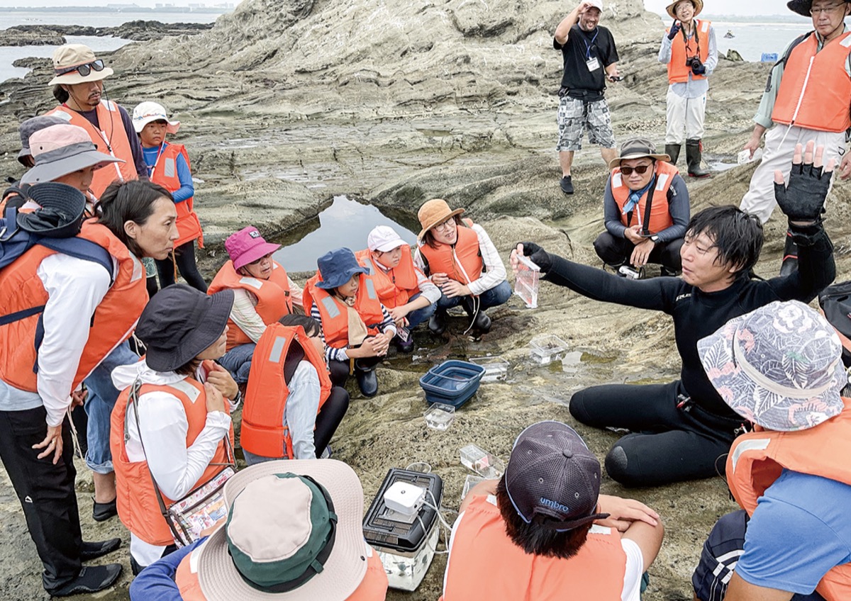 小峯和朗さんを講師に迎えた生物観察会では、この時期に見られる季節来遊魚のギンユゴイやオヤビッチャ、イソスジエビ、ウミウシなどを観察。毒のないカブトクラゲにさわり、ぷるぷるの感触を確かめた。小峯さんは「磯場の足元には小さな命がいて、近づいてみるとたくさんの発見があります」と話した。