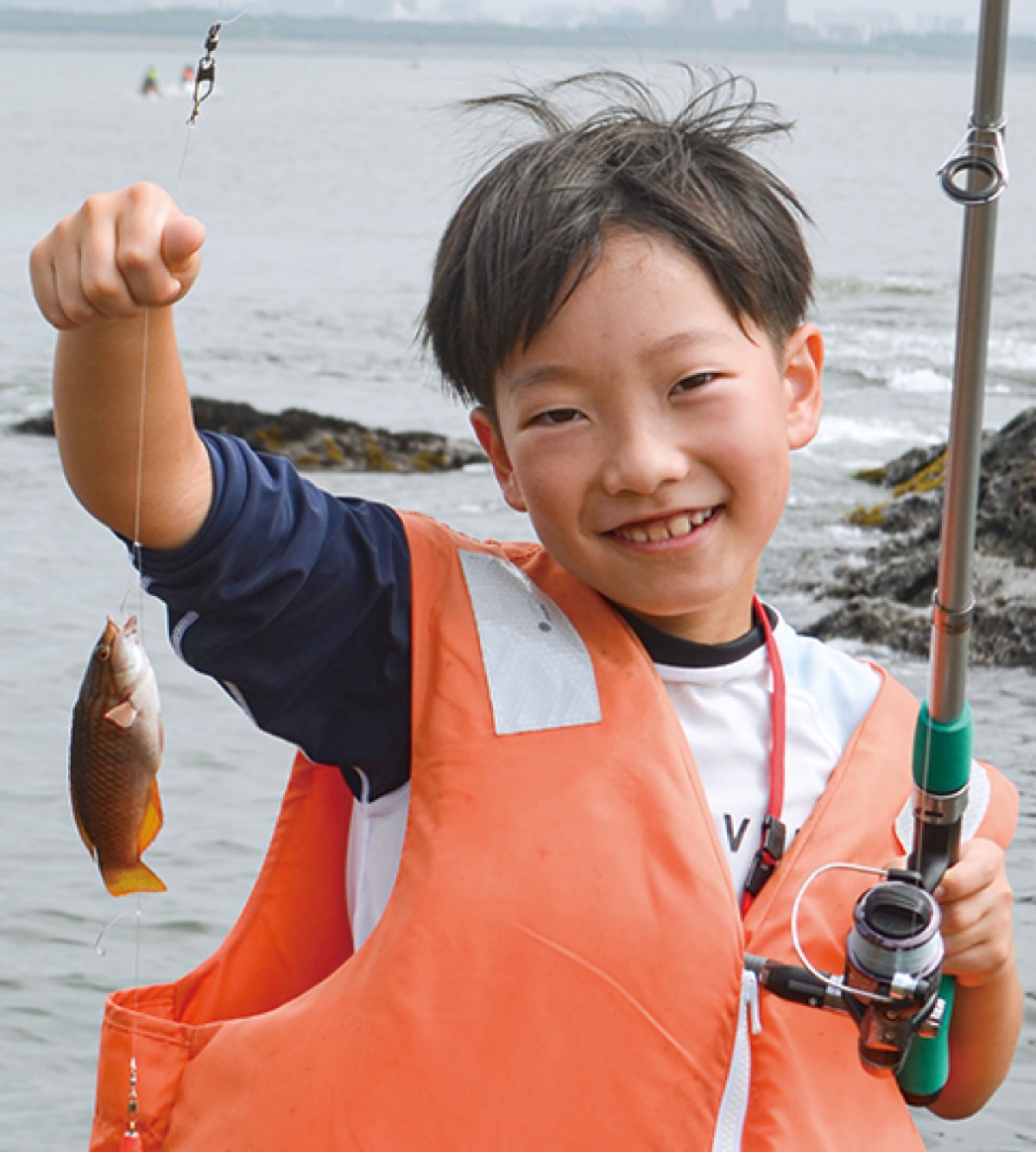 参加者は釣具店の石井芳夫さんから釣り竿の扱い方や仕掛けのつけ方を教わり、渡船えぼし丸(石井満夫船長)で姥島へ上陸。「くじら通し」と呼ばれる水路がある島の東側で釣り糸を垂らした。指導役を務めた大塚亮太さんに「釣り針が見えないように丁寧に餌をつけるのがコツ」とアドバイスを受け、ネンブツダイやカサゴ、ベラなどを釣り上げた。