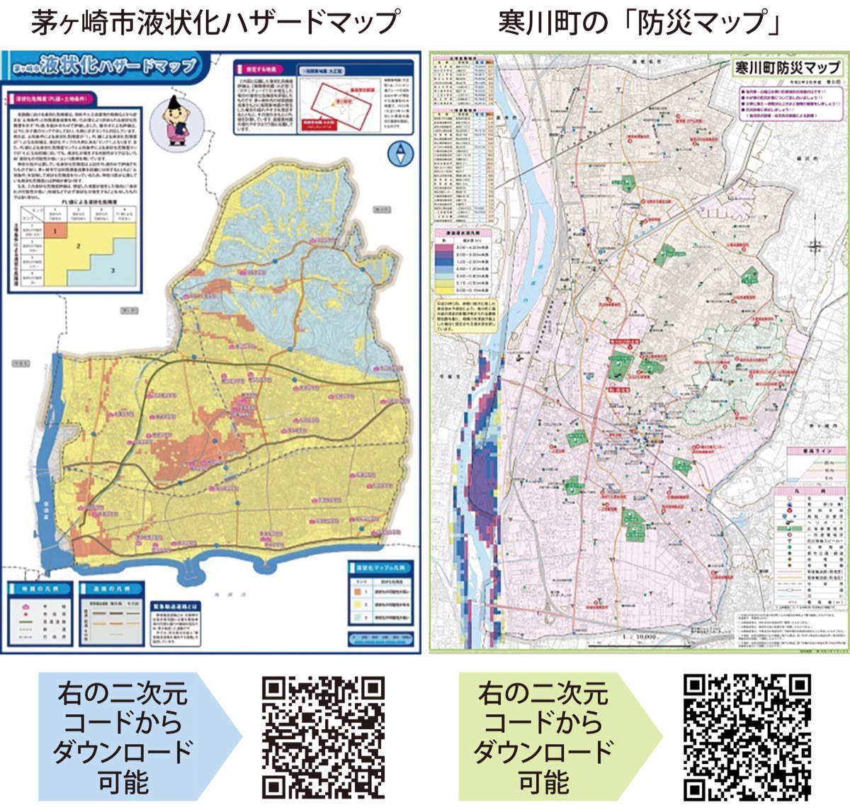 災害が発生すると想定される場所や被害の大きさを表すハザードマップ。茅ヶ崎市は津波、液状化のほか洪水・土砂災害のハザードマップを、寒川町も広域避難場所や津波想定を記した防災マップを作成しウェブサイトで公開している。