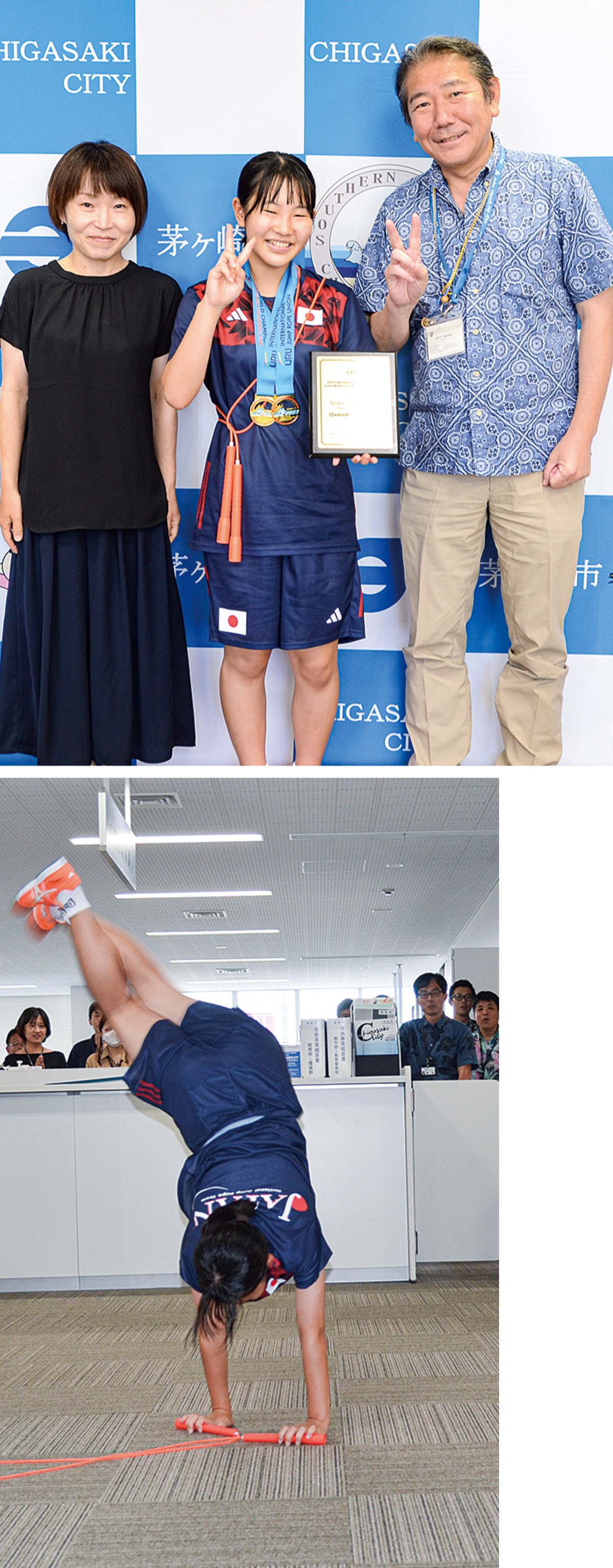 獲得した金メダルと盾を披露した咲来さんは大会前に行った高地トレーニングや、猛暑での練習の上で臨んだ大会を振り返り、「緊張したけれど楽しかった」と声を弾ませ、「市内のイベントなどで演技を披露できたら」とし、競技の普及に向けて意欲をのぞかせた。佐藤市長は「世界大会で総合優勝を果たすとは驚いた。茅ヶ崎が誇るアスリートの登場。県民、国民に知ってもらえるようにサポートしていきたい」と話した。