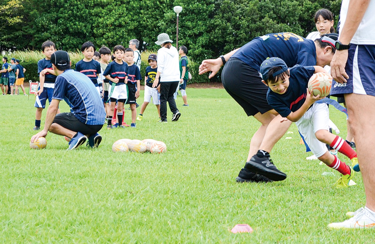茅ヶ崎ラグビースクール(赤阪忠行校長)が9月9日、柳島しおさい公園でラグビーの無料体験会を開催。未就学児と小学校の児童らが、芝生の上で楕円のボールにふれあった。