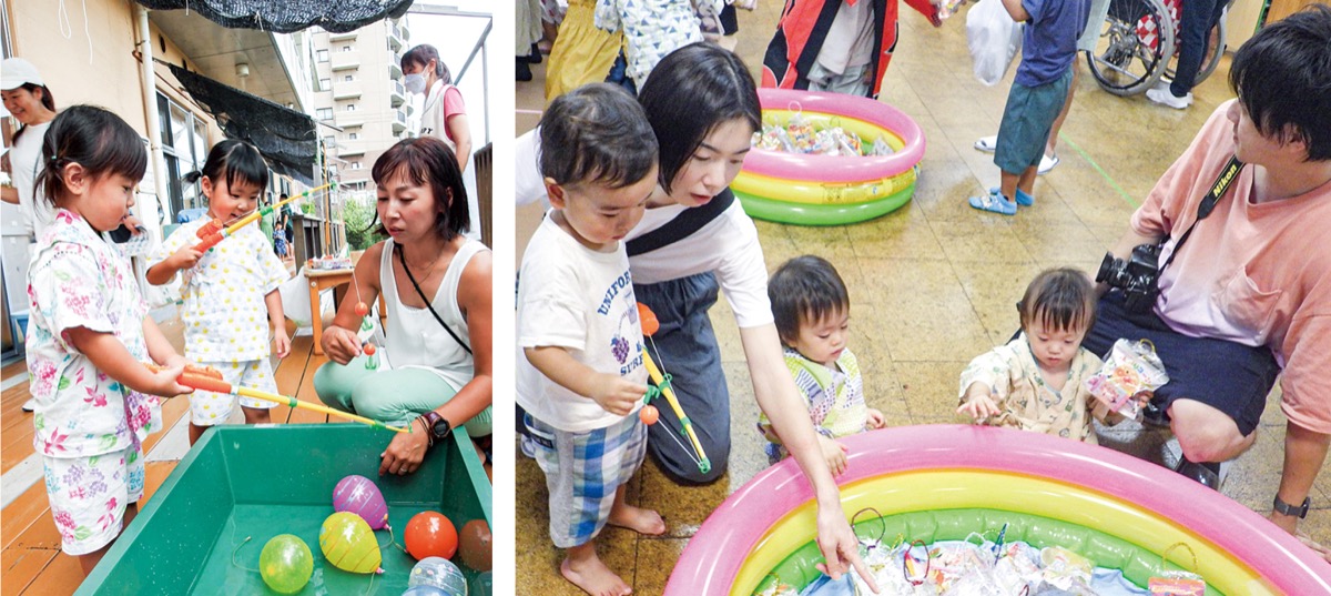 今回、催しコーナーはスタンプラリー方式で実施。来場者はカードを片手に、かき氷や綿あめ、ヨーヨー釣り、宝さがし等のブースを楽しそうに回っていた。飲食コーナーでは、家族同士での談笑や、数年ぶりの再会を喜び合う家族の姿も見られた。祭り後半は、入居者の合唱や子どもたちによるダンスで盛り上がった。同会が運営するうーたん保育園の佐藤愛美園長は「会場に向かう後ろ姿はわくわく弾んでおり、帰りの後ろ姿は喜びをまとっているようで、胸いっぱいの夏祭りになった」と話した。