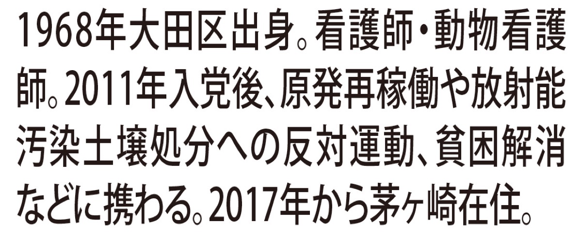「看護師ならびに、親からの虐待経験を生かし、弱い立場の人が希望を持てるまちづくりを目指したい。具体的には、小学校給食無償化や自校式の中学校給食実現のほか、小中学校トイレへの生理用品の無償設置などに注力していく。また、虐待経験者は、うつ病や社会適応障害など二次障害を抱えることも多く、それにより定職に就けず生活が困窮することがある。根本治療のために医療費の助成などでサポートできたら。さまざまな問題で苦しむ人に手を差し伸べていきたい」
