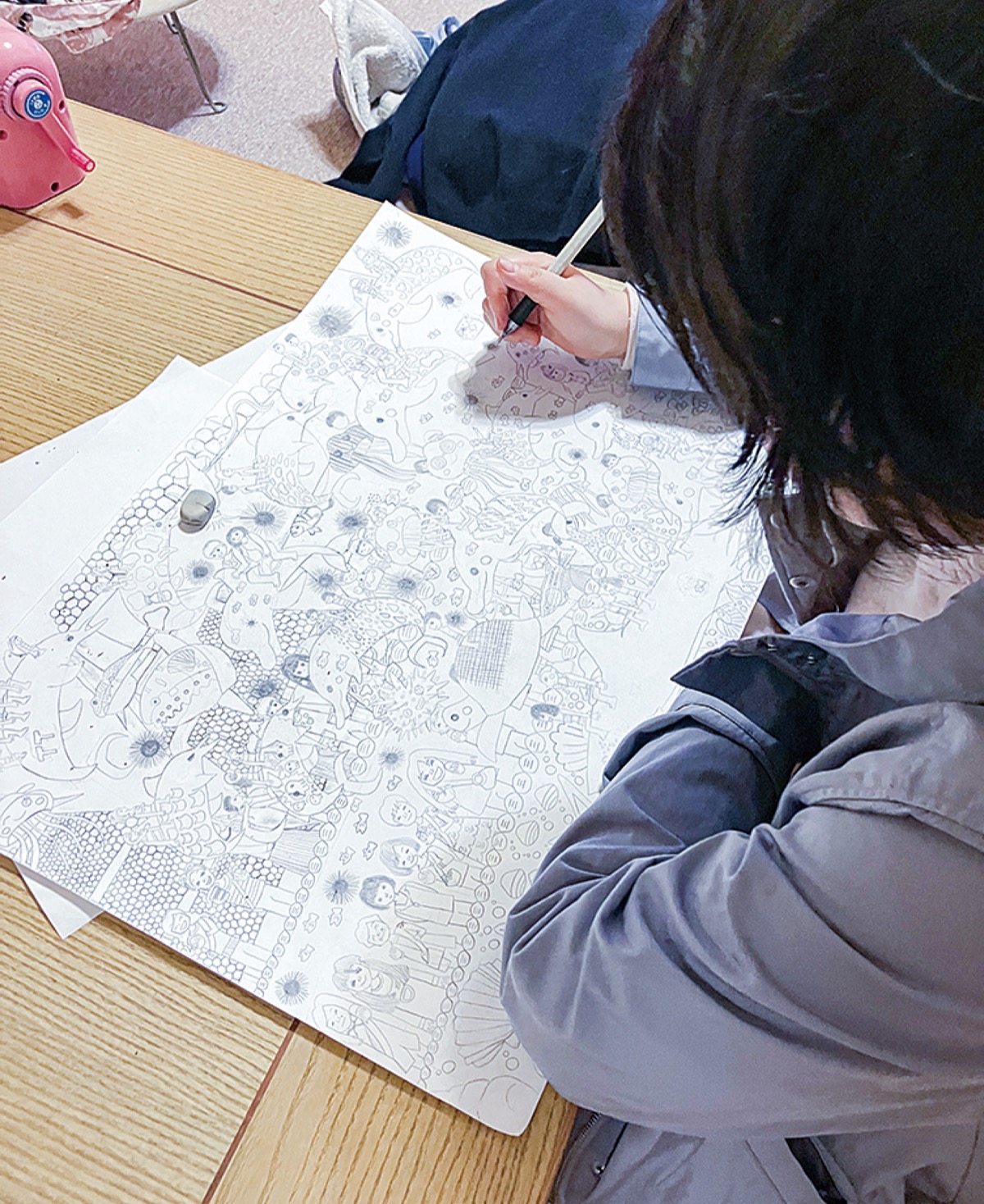 最近では評判を聞いて、施設や企業から制作のオファーが寄せられるようになった。その際は必ず現場に足を運ぶというFukaさん。放課後デイサービス「キッズおりーぶの木 茅ヶ崎」(赤羽根)から依頼を受けた作品では、施設で「ヘルマンハープ」を使っているのを見て、ハープにあわせて利用者が歌う様子を描いた。