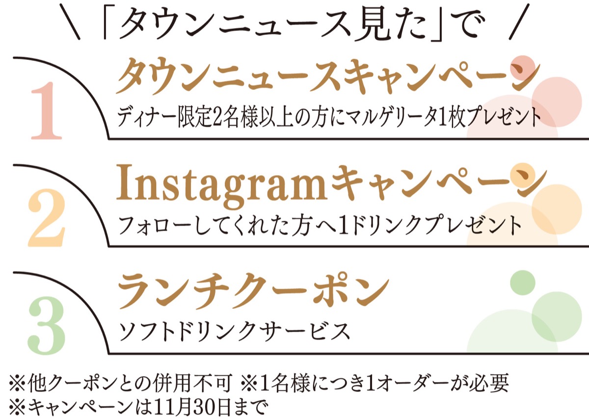 カウンター、テーブル、ソファー席とお一人様やカップル、家族などさまざまなシーンに合わせて利用可能。記念日などの大事な食事にはハート型のピッツァを提供するといったサービスもあるほか、テイクアウトも実施しているので店の味が自宅で楽しめる。駅徒歩1分に姉妹店あり。