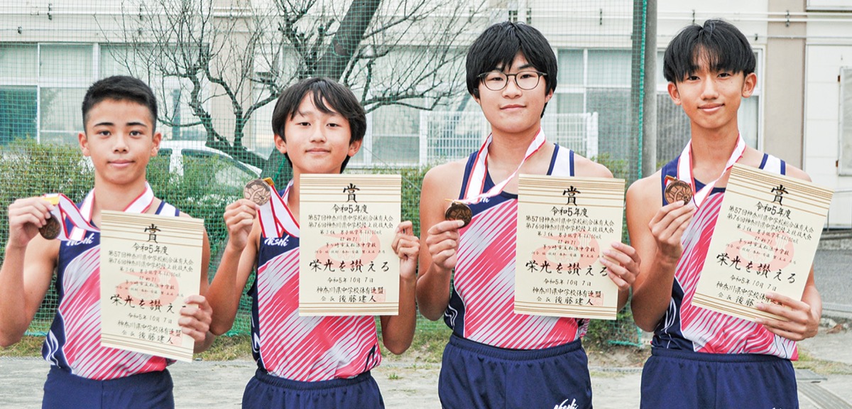 神奈川県中学校陸上競技大会が10月7日、横浜市の三ツ沢公園陸上競技場で開催され、男子低学年(1・2年生)4×100mリレーで松浪中学校が3位に入賞した。