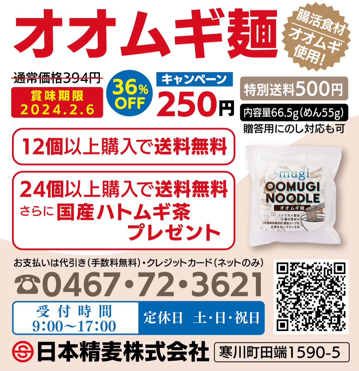 今なら600食限定で1袋通常394円が250円に。12個以上(3000円〜)なら送料無料、24個以上(6000円〜)はさらに国産ハトムギ茶を進呈。左の二次元コードか電話で「タウンニュース見た」と申し込みを(価格は税込)。