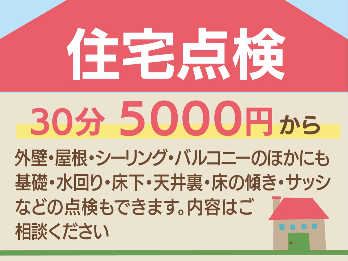 点検は、戸建て・アパート・マンションは外壁、屋根、シーリング、バルコニー等の点検だけであれば所要時間30分程度で5千円から可能、報告書も付いてくるので安心だ。事前に説明するので、まずはお問い合わせを。