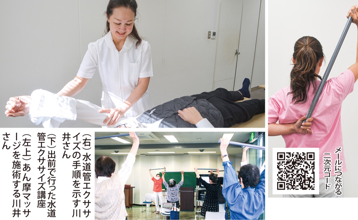 「訪問専門たかの治療院」の代表を務める川井孝乃さんは、あん摩マッサージ指圧師(国家資格)として訪問リハビリマッサージ、水道管エクササイズ(体操教室)を行っている。