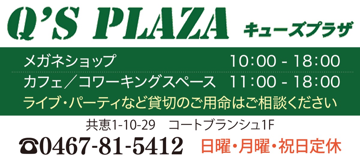 茅ヶ崎駅南口から徒歩5分、カフェ「キューズプラザ」はサザン通り商店街に2022年6月にオープンした。生損保業の基幹システム開発やホームページ制作を手掛けるIT事業者・キューズプランニングが運営を手掛ける。当初は廃業する共恵のメガネ店から機材や商品在庫を引き継ぎ16年にオープンしていたが、「メガネの調整などの待ち時間にコーヒーを提供できたら」という考えからカフェ併設型のメガネ店という珍しい形態を取り、より広くなった現在地へと移転しさらなる発展を遂げた。