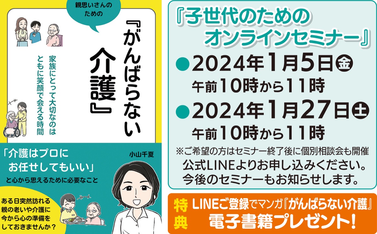 こうした対応ができるのは自身の経験と学びに裏打ちされているとする小山さん。「独身時代に父方の祖母を在宅で9年間介護した経験を経て、自己犠牲の上に成り立たせざるを得ない『嫁や子が看るのがあたりまえ』な社会に疑問を感じていました。当法人を設立し『子世代の心構え』『健康寿命を延ばすことの大切さ』を発信しています」。