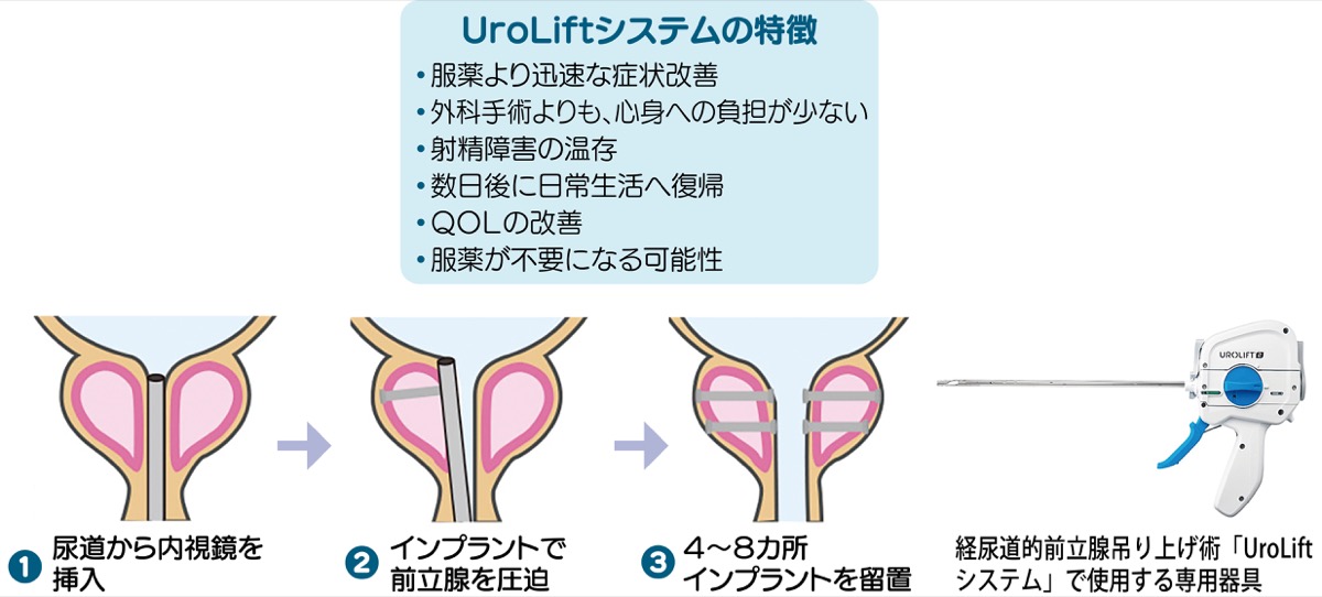 同システムは、尿道から専用の器具を挿入し、前立腺の中に小型のインプラントを埋め込む治療法。4〜8本ほどのインプラントで、肥大した前立腺を縫縮して持ち上げ、尿の通り道を開通させることで、排尿しやすくするという。