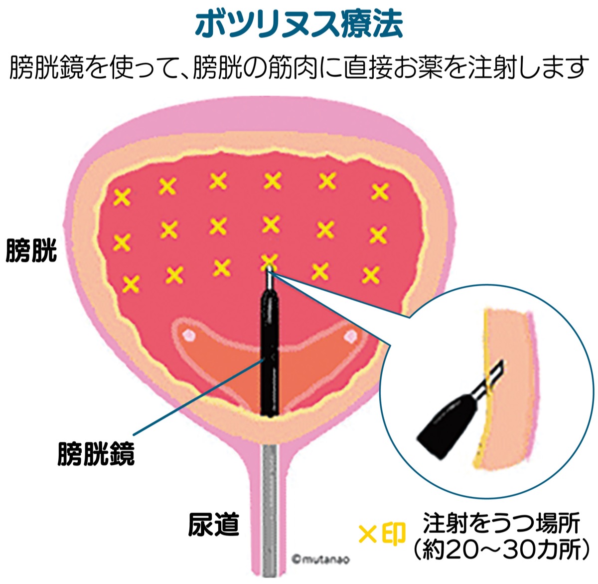 それでも効果が見られない場合は、新しい治療法「ボツリヌス療法」を選択するのも一つ。「天然のたんぱく質である『ボツリヌストキシン』を膀胱の筋肉に直接注射することで、排尿症状に関わる神経伝達物質をブロックし、過剰な膀胱の筋肉の緊張をゆるめて異常な収縮をおさえます」