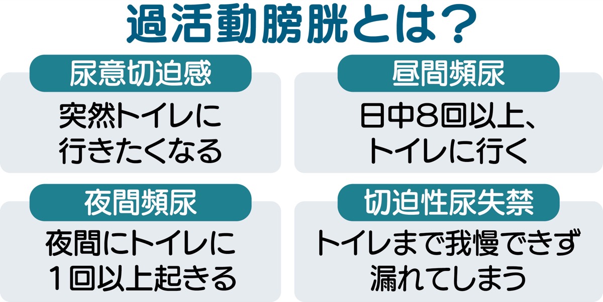昼間・夜間の頻尿や、切迫感など「過活動膀胱」の症状を持っている人は、年齢とともに増え、50代女性の8人に1人が該当すると言われている。男性の場合も、前立腺肥大に準ずる過活動膀胱も多い。