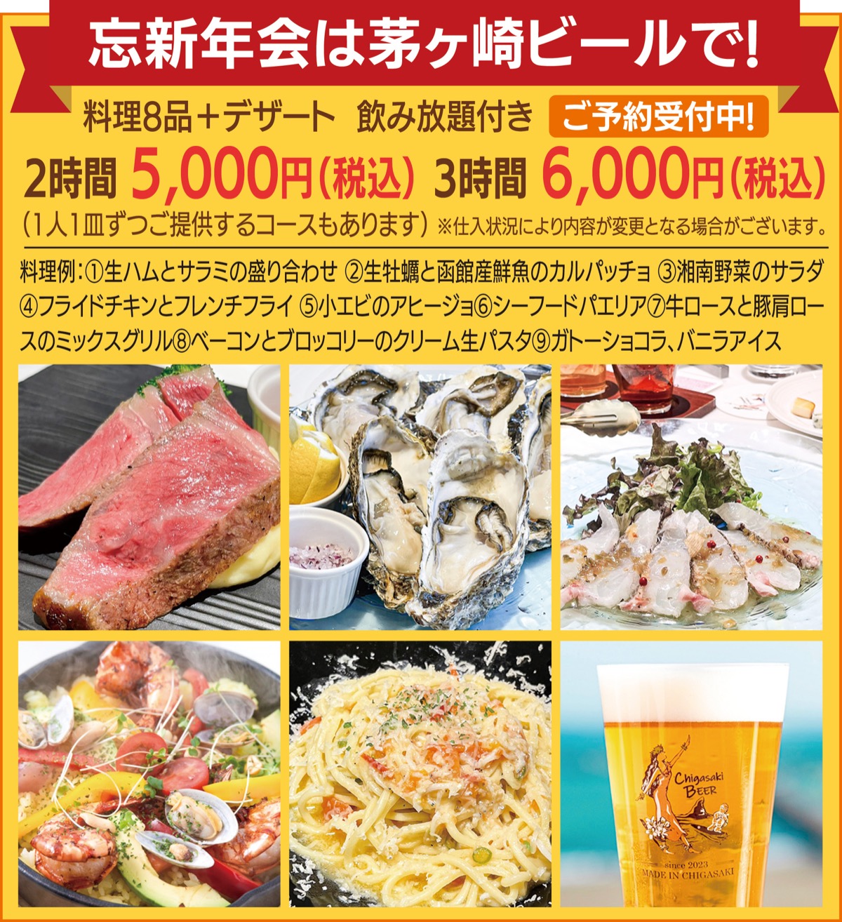 国道134号線沿いの「茅ヶ崎ビール」ブルワリーレストラン(1・2階でビール醸造)では、お得な忘新年会予約を受け付けている。