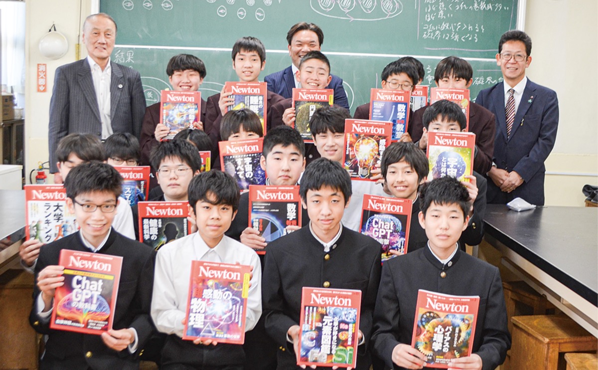 山田会長は「この雑誌をきっかけに科学への興味や関心を広げて、皆さんが未来のニュートン、エジソンになってほしい」とあいさつ。受け取った科学部部長の渡邊崚多さん(2年)は「実験の内容など、すべて自分たちで考えて決めているのでニュートンを参考にすることもある。これからも活用していきたい」と話していた。