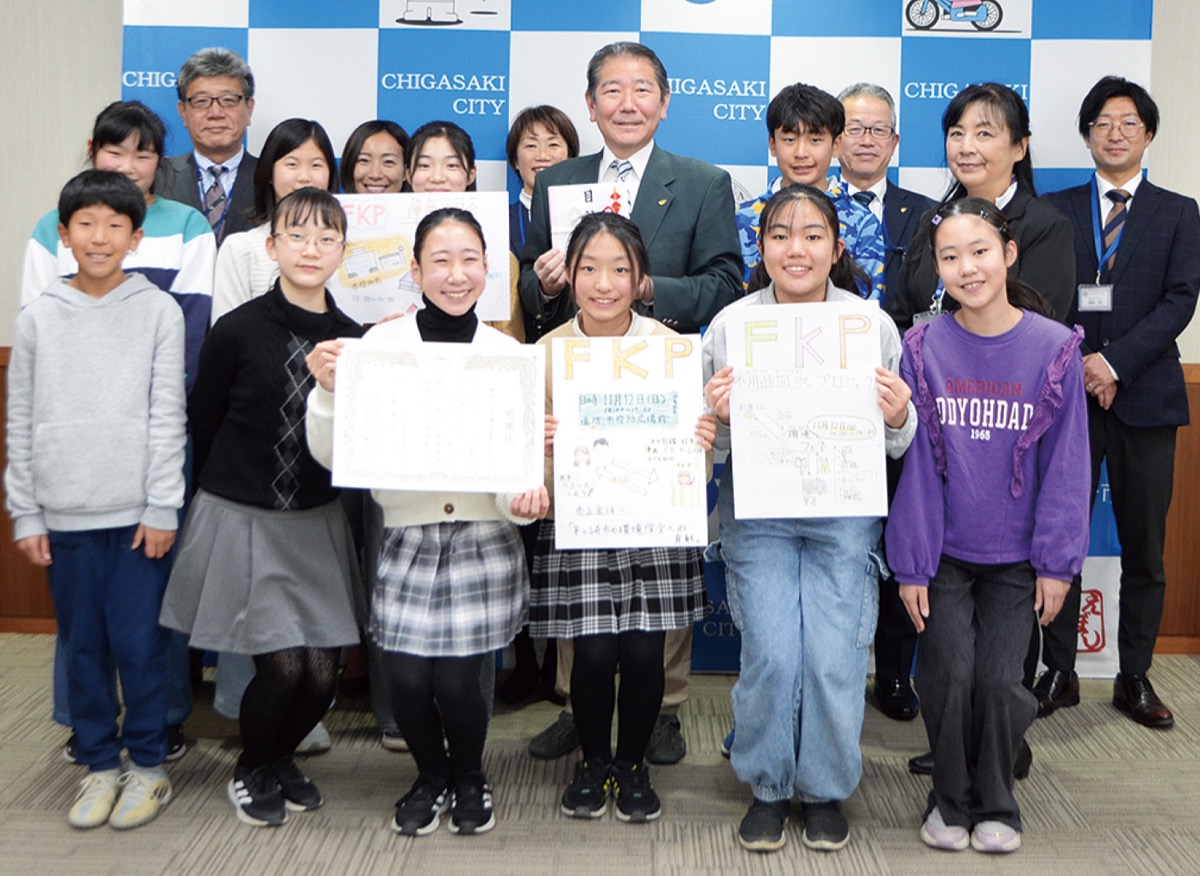 梅田小学校の児童が1月31日、不要品回収プロジェクト(FKP)の売り上げ1万5775円を、太陽光発電設備普及啓発基金と緑のまちづくり基金に寄付。佐藤光市長から感謝状が贈られた。