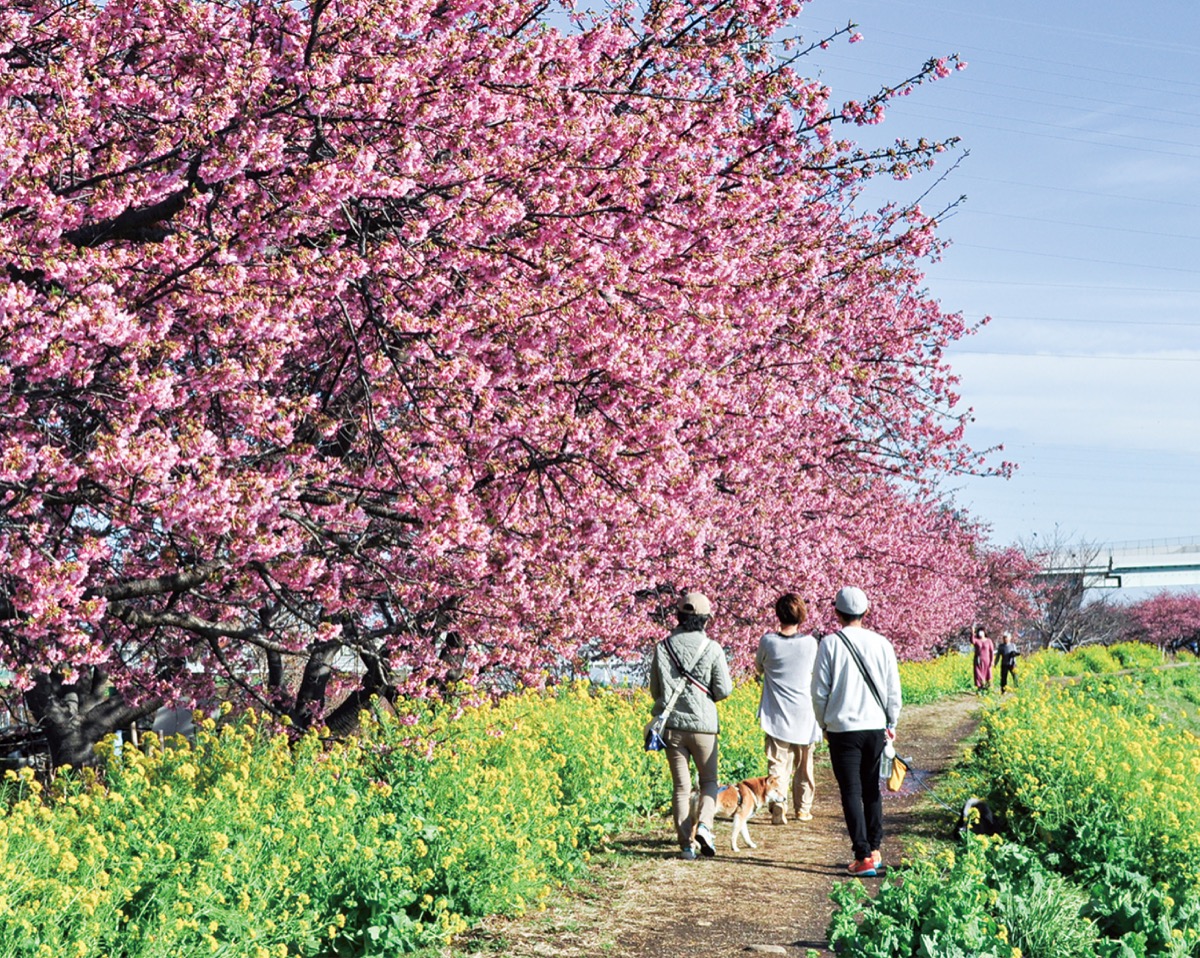 同会が2001年に植えた約70本の河津桜は、菜の花との共演のほか、富士山や箱根連山、丹沢山を望める名所として多くの人が訪れる。今年は2月20日時点で5〜7分咲きとなり、菜の花とともに見頃を迎えている。
