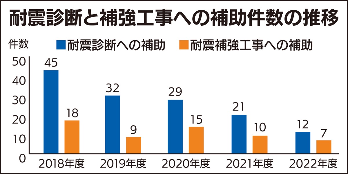 一方で耐震改修促進事業に関しては、18年度には45件だった耐震診断への補助件数が22年度には12件に、耐震補強工事への補助も18年度の18件から22年度は7件になるなど、近年、利用数は減少傾向にあった。