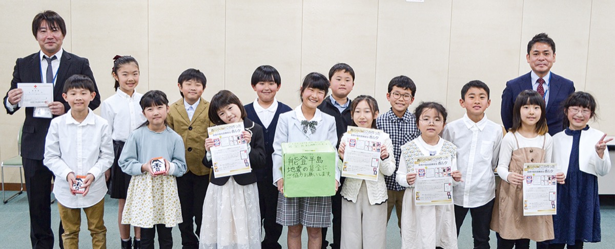 児童たちは「お金を被災地のために使ってほしい」と話し、竹内教育長は「困っている人のために、協力して行動したことは皆さんにとっても大きな成長になったと思う」と称えた。