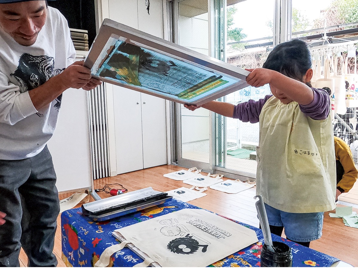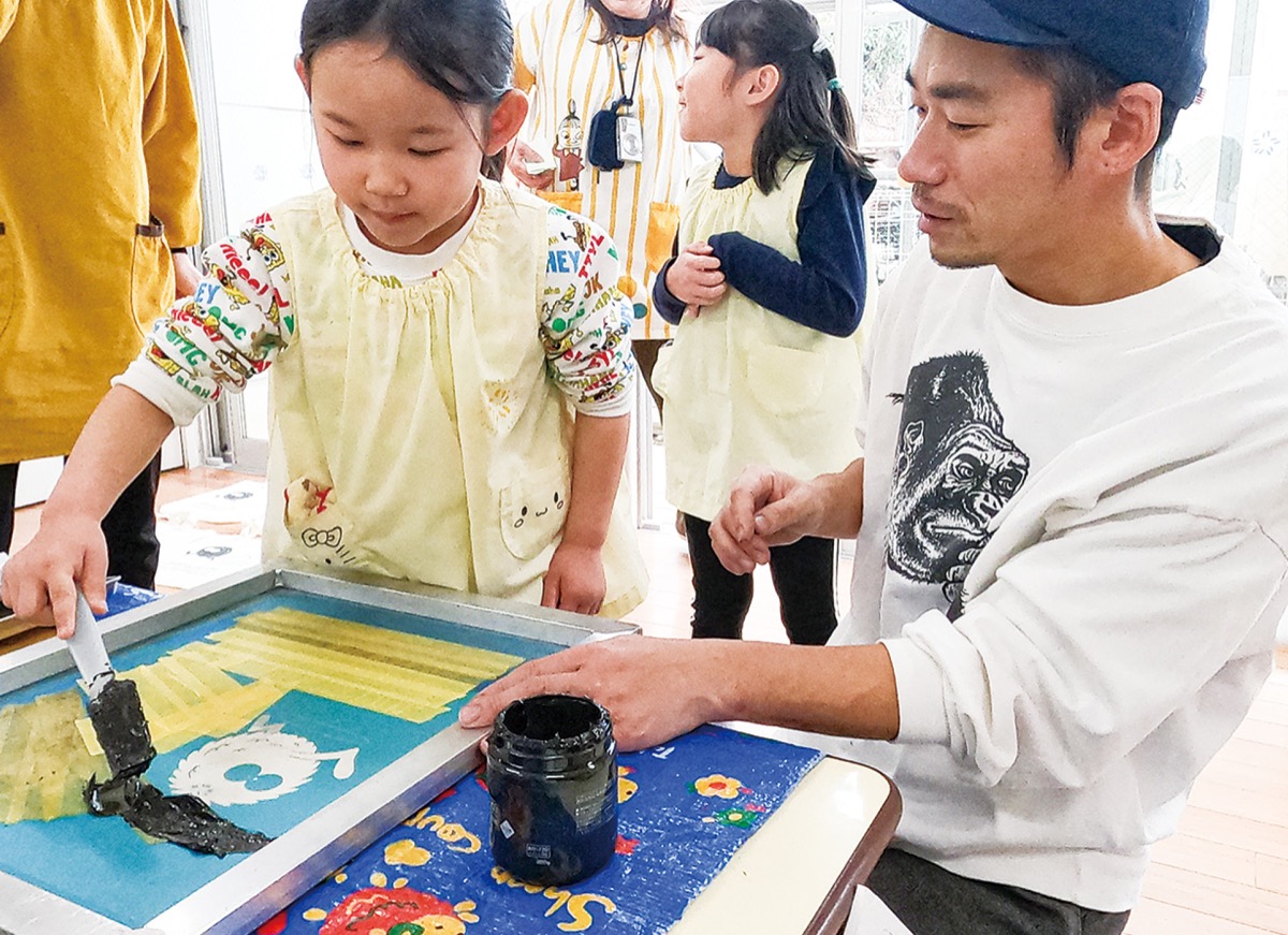 市内在住のアーティスト・UNO YOSHIHIKOさんによるシルクスクリーンの体験ワークショップが2月29日、十間坂保育園(坂巻清園長)で行われた。