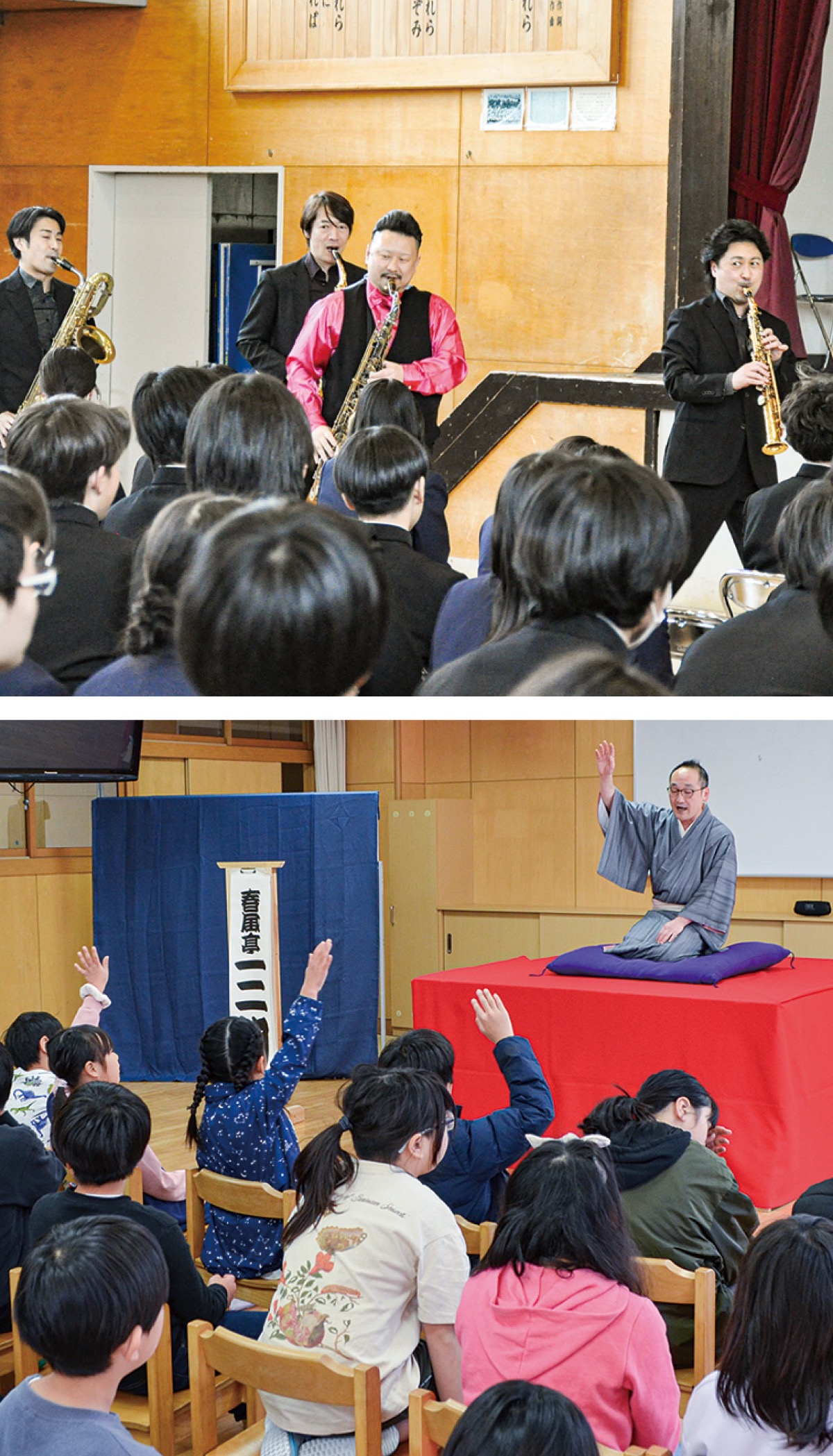 茅ヶ崎市文化・スポーツ振興財団が実施しているもので、2月29日にはサクソフォンカルテットの「カルテット・スピリタス」が中島中学校を訪問。「カルメン幻想曲」などクラシックの名曲や童話をもとにした「紙芝居オペラ『MOMOTARO』」を演奏した。
