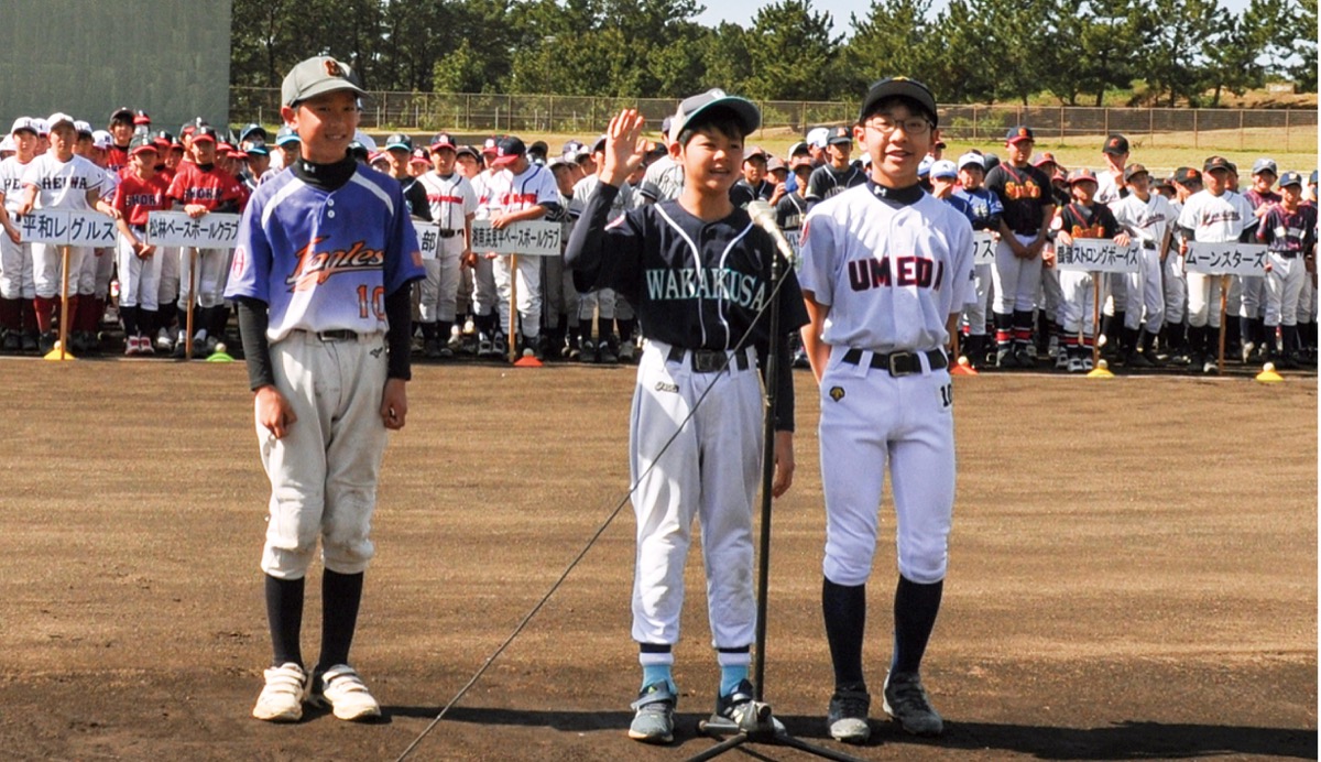 この日は入場行進や優勝旗、優勝杯の返還が行われた後、茅ヶ崎野球協会の久門聖志副会長が「全てのチームに優勝のチャンスがある。練習の成果を発揮してほしい」と激励。安藤駿汰さん(梅田スポーツ少年団)、早川輝さん(若草野球部)、大川智史さん(矢畑リトルイーグルス)の3人による選手宣誓が行われた=右写真。