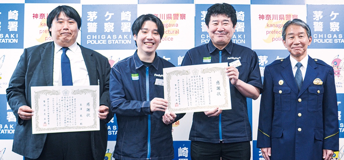 特殊詐欺を未然に防ぎ表彰されたのは、ファミリーマート茅ヶ崎中島店従業員の星野泰貴さん(28)。3月19日、不慣れな様子でアップルの電子マネー5万円分を購入しようとした高齢男性に対し、不審に思い「お孫さんにですか」と声掛けをし、男性が「マイクロソフトから電話があって」と答えたため、店長に報告し通報した。星野さんは「詐欺がこんなにも身近とは。みんなで注意して防いでいけたら」と話した。