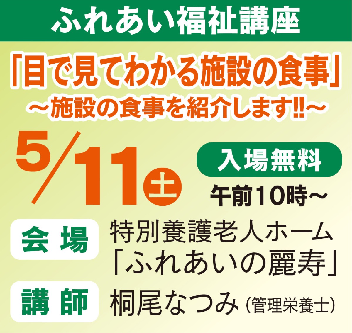 社会福祉法人「麗寿会」は5月11日(土)、ふれあい福祉講座を開催する。テーマは「目で見てわかる施設の食事」、時間は午前10時〜11時半。会場はふれあいの麗寿。参加無料(申込不要)。