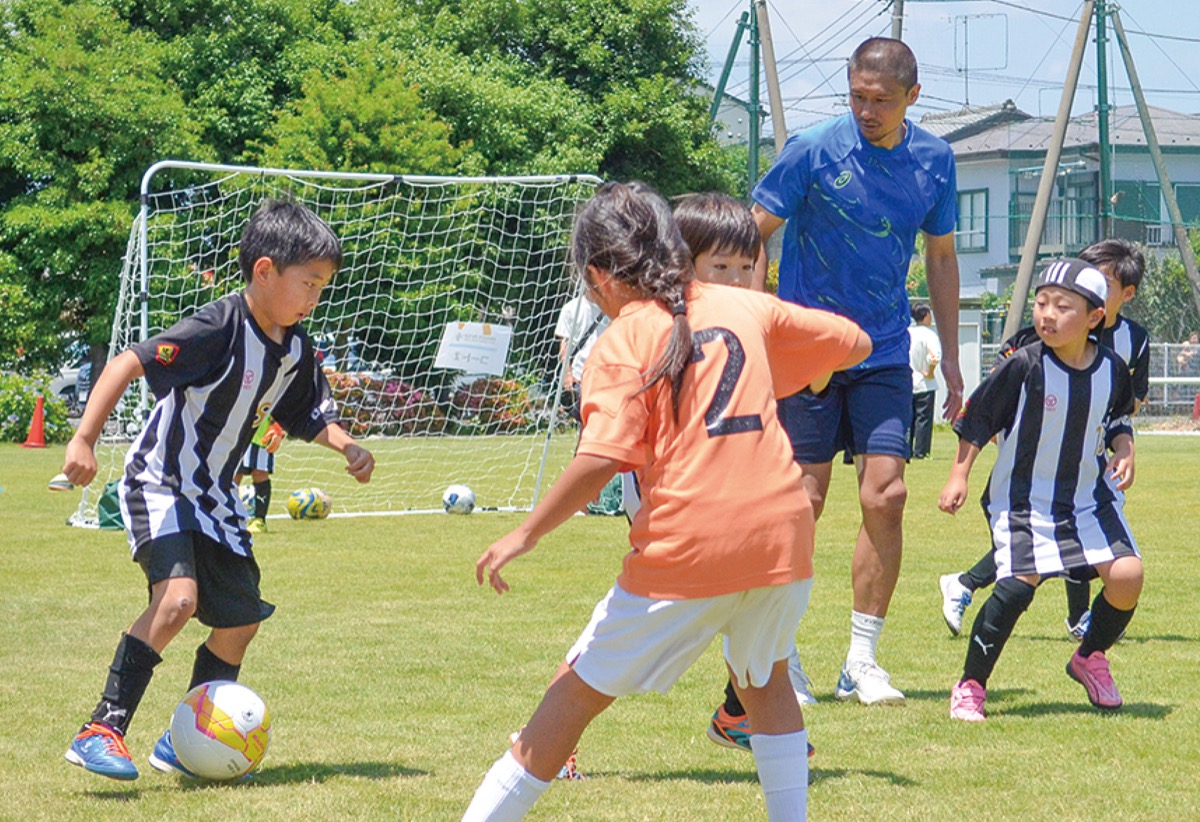 大会アンバサダーを務めたサッカー元日本代表の坪井慶介さんも時折、子どもたちと一緒にプレーし、スルーパスやヘディングで会場を沸かせた。