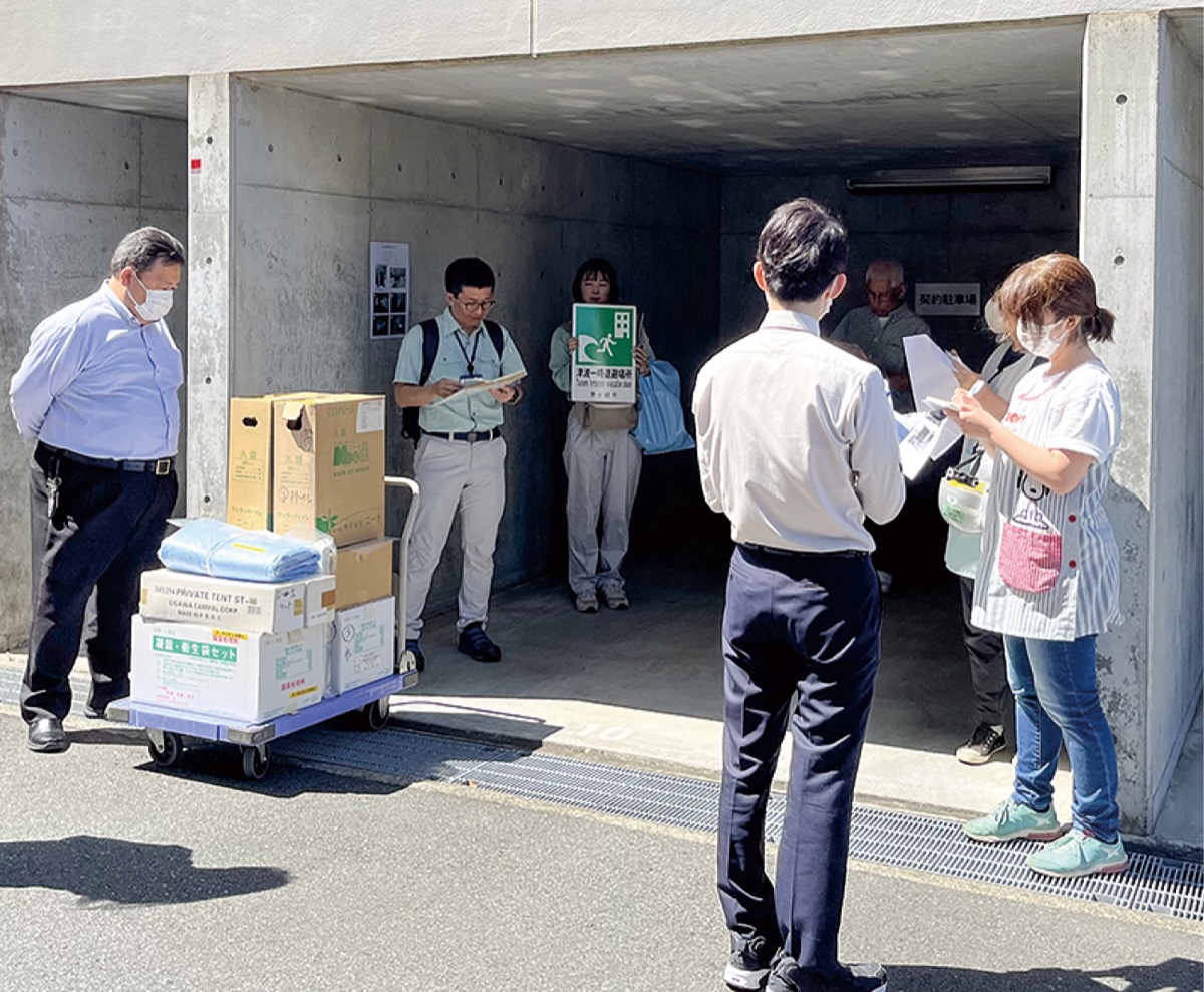 当日は、幸町自治会関係者や医療従事者、テナント職員、ビル管理会社スタッフや消防訓練業者、市防災対策課職員など約20人が参加。避難経路となる外階段を実際に上って確認したり、備蓄品の紹介などを行った。市職員から「津波警報が発表された際は、いち早く高い場所へ逃げることが重要。率先して『避難者になる』意識を持って」と話しがあると、参加者は大きくうなづいていた。