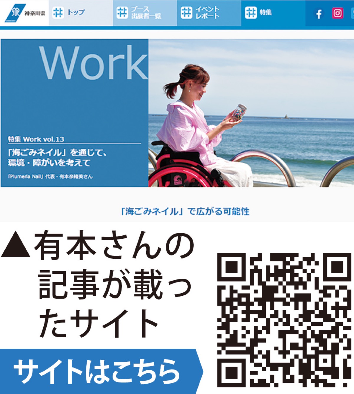 最新の記事では、海洋プラスチックごみで、ネイルチップ(つけ爪)を制作する「海ごみネイル」の活動を茅ヶ崎市内などで行う「Plumeria Nail」代表の有本奈緒美さんを取り上げている。サイトは上記二次元コードよりアクセスを。