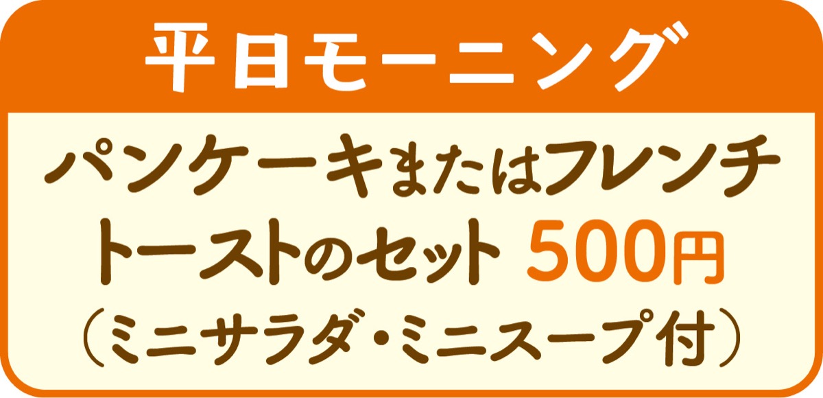 併設レストランでは毎朝7時からのモーニング(LO10時)が人気。特にパンケーキ、フレンチトーストのセット(ミニサラダ・ミニスープ付)が500円。お勧めだ。