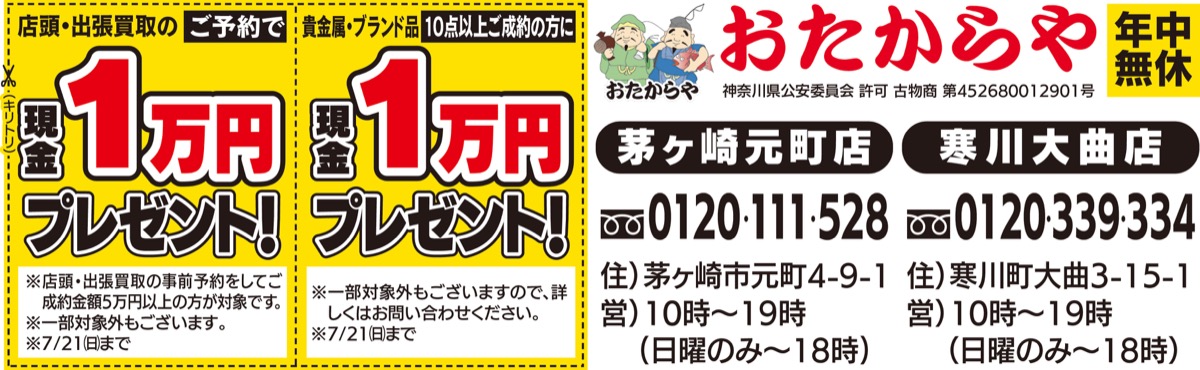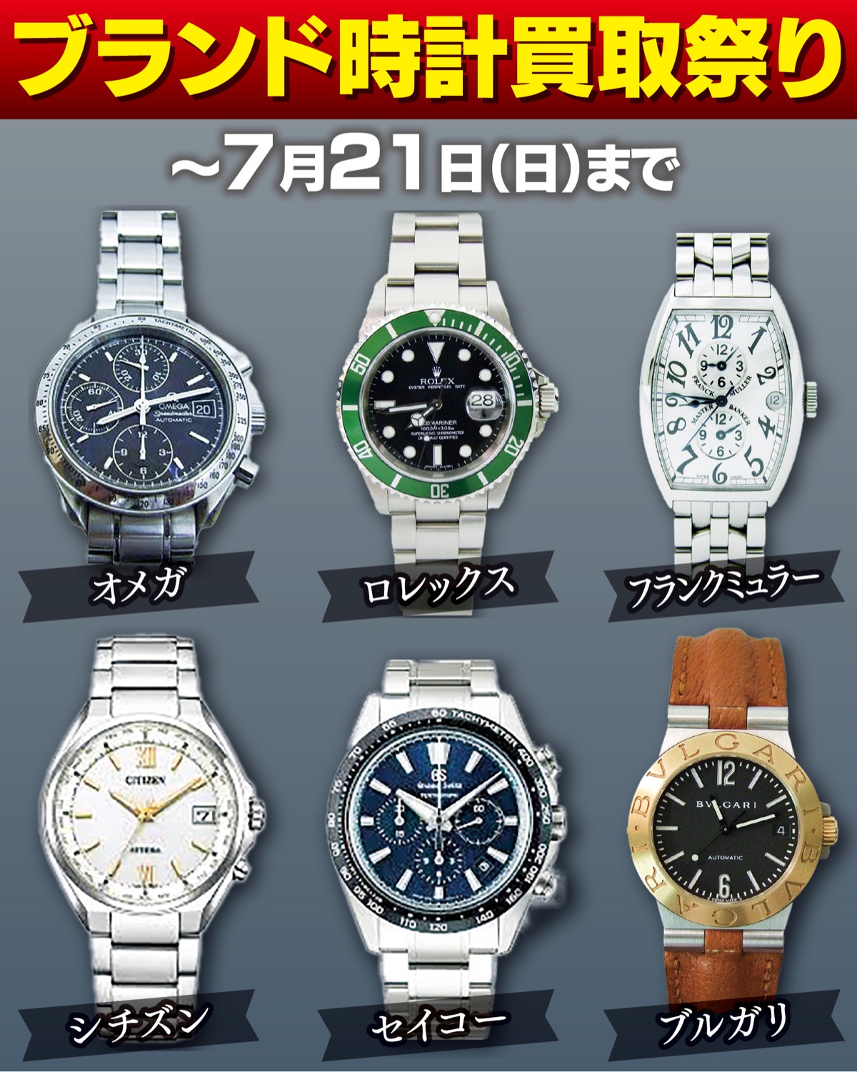 茅ヶ崎駅北口徒歩3分の「おたからや茅ヶ崎元町店」と中原街道沿いの「おたからや寒川大曲店」では現在、ロレックスやオメガ、フランクミュラー、ブルガリ、シャネル、グッチのほか、セイコーやシチズンなどのブランド時計まで高価買取中だ。7月21日(日)まで。