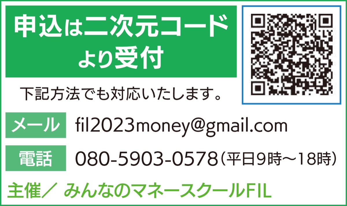定員は各日6人(20歳以上)。筆記用具を持参。講師は業界歴18年の岩下剛さん、同13年の小川亜紀子さん、同12年の石川直人さん、同9年の松本美紀さん。講師は各日2人。「お金に関わる不安や悩みの解決に、セカンドオピニオンとしても活用してもらえたら」と岩下さん。参加者にはお茶、菓子付き。参加申込は応募方法に記載の二次元コードから。個別相談にも対応、まずは問い合わせを。