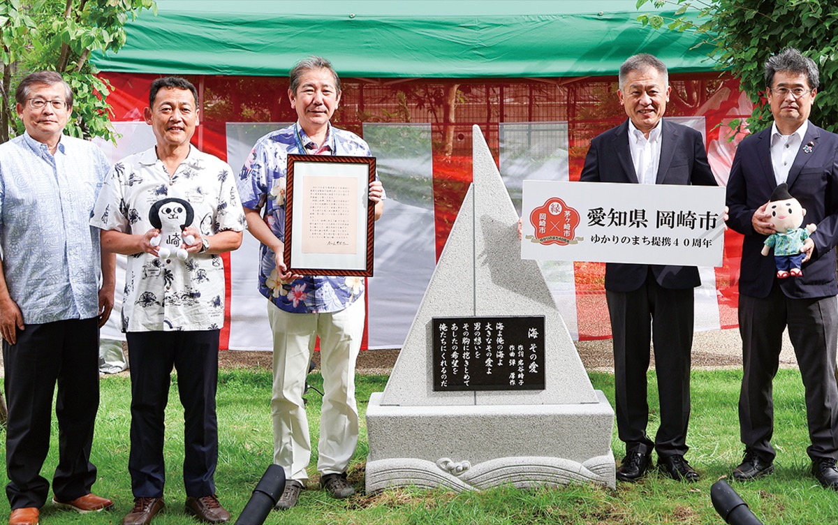 今回は提携40周年を迎えたのに加え、加山さんが47年ぶりに茅ヶ崎市の名誉市民となったことから、茅ヶ崎市は加山さんの代表曲の一つで試験放送に使用されるなど市とのなじみが深い「海 その愛」の歌碑で、かつ加山さんをイメージした作品を要望していた。岡崎市が寄贈作品を募集したところ、同市で石材店を営む小野直行さんの作品が選出された。