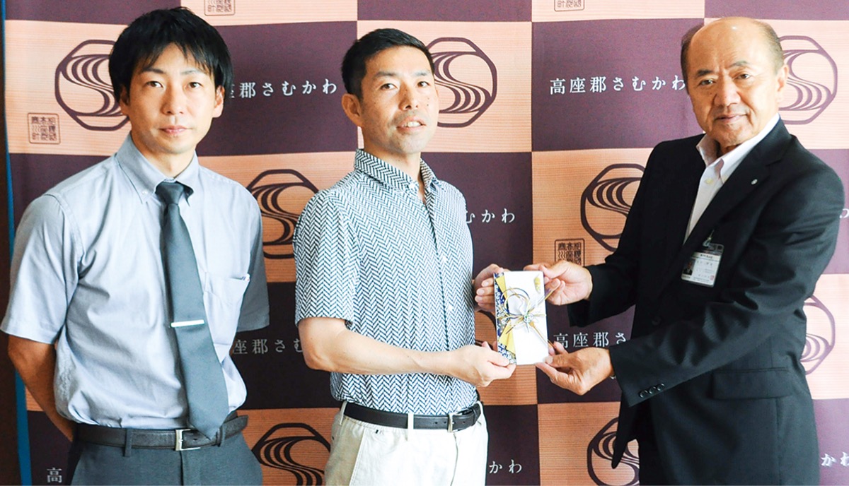 同社が毎年行っているもので、今回で3回目。山本代表取締役は「寒川からのお客様も多く、地元愛を伝えてくれるのが励み。子どもが明るく元気に育ってくれると町も元気になる。子どもたちのために活用してほしい」と木村俊雄町長に目録を手渡し、木村町長は「寒川や茅ヶ崎はオリンピアンを多数輩出するなど若者の活躍が著しい。貴重な浄財を有効活用させていただく。引き続きまちづくりに協力を」と答えた。