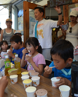 5分間で食べた同店のカップアイスの量を競うイベントで、今回は過去最多の約50人が参加。男性部門は松木宏人さんが14個と1口、女性部門は沖絵梨さんが12個と半分、小学校高学年部門は木下輝一さんが5個と半分、同低学年部門は冨士川仁氣さんが4個と3分の2を食べて優勝した。