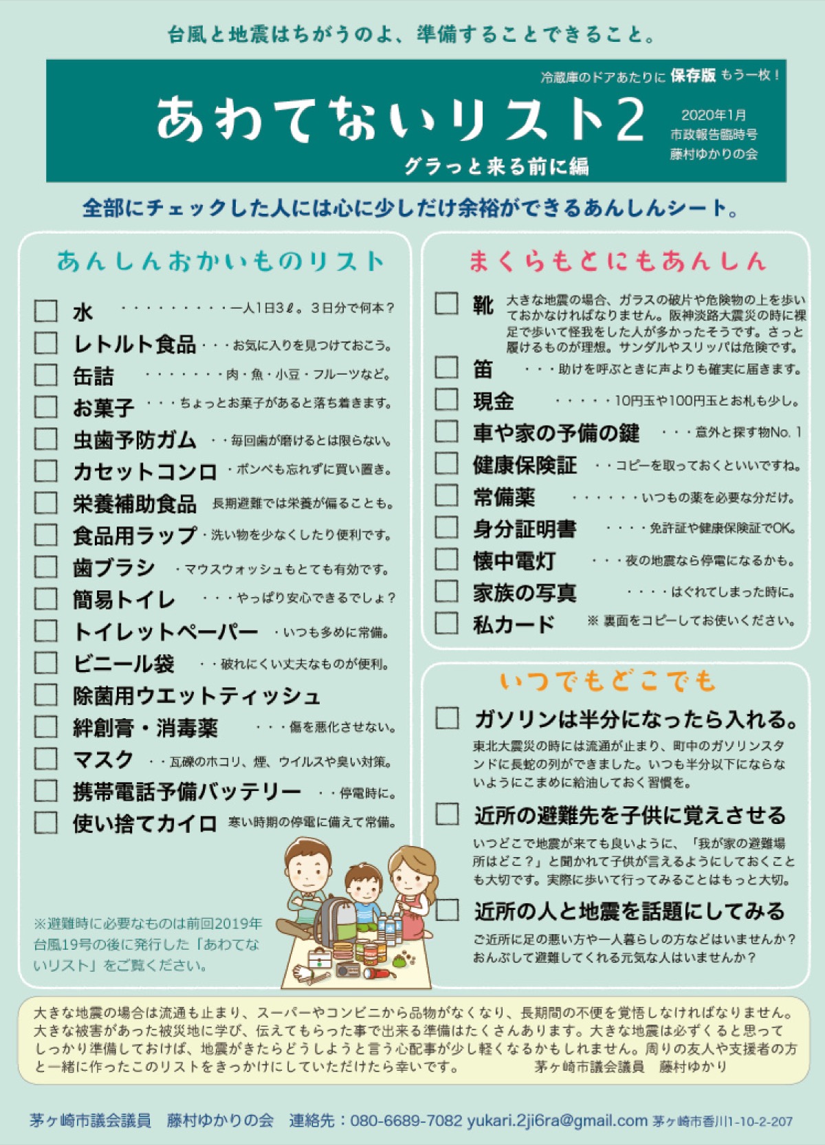 災害そのものを防ぐことはできなくても、備えることはできます。私のホームページでは現在、備蓄品を一覧にした「あわてないリスト」を公開しています=写真。