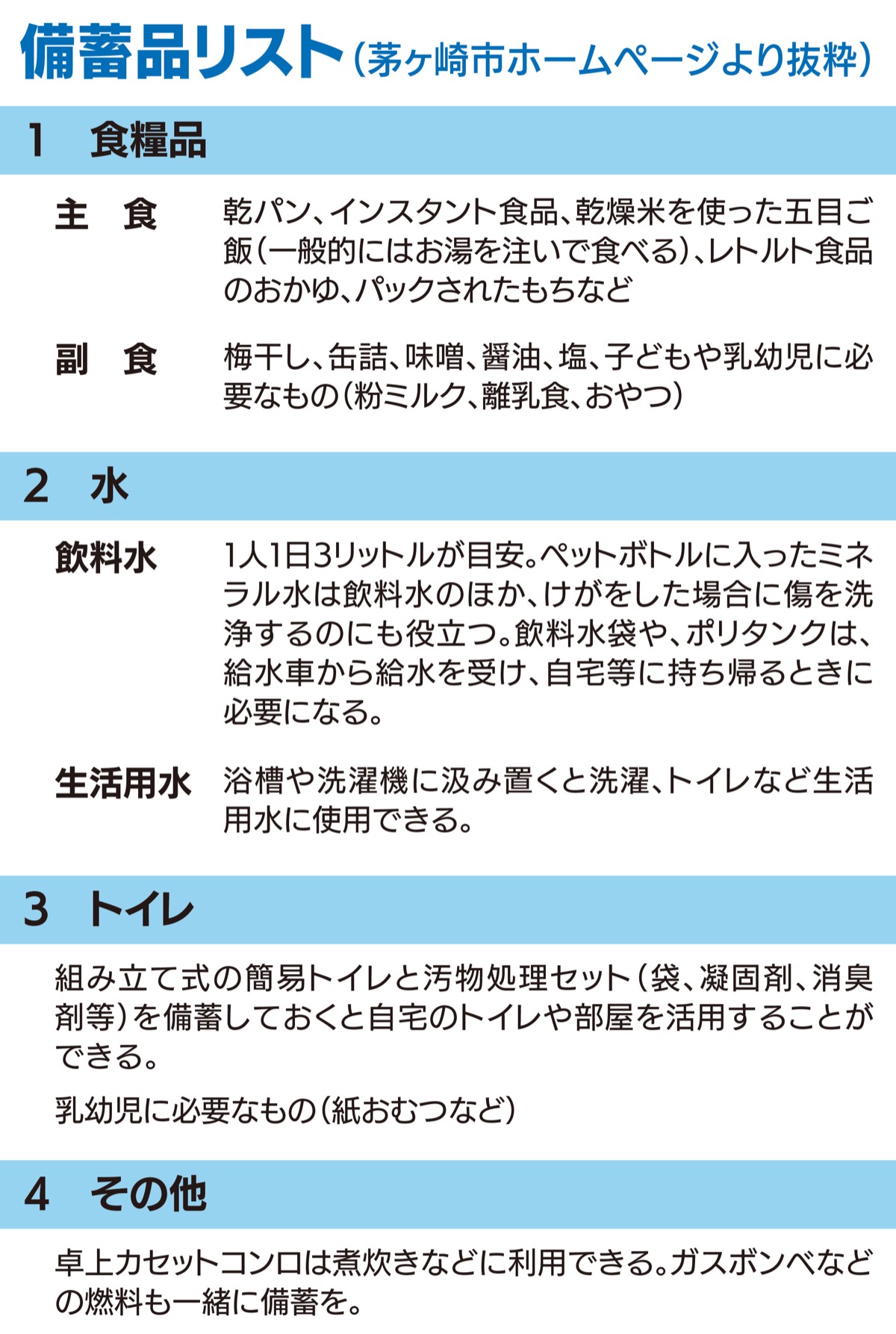 ただ、これらは「約3日間」を想定したもので、茅ヶ崎市防災対策課では「普段から家庭で食料や飲料水など最低限7日分の備蓄を」と呼びかける(左表参照)。